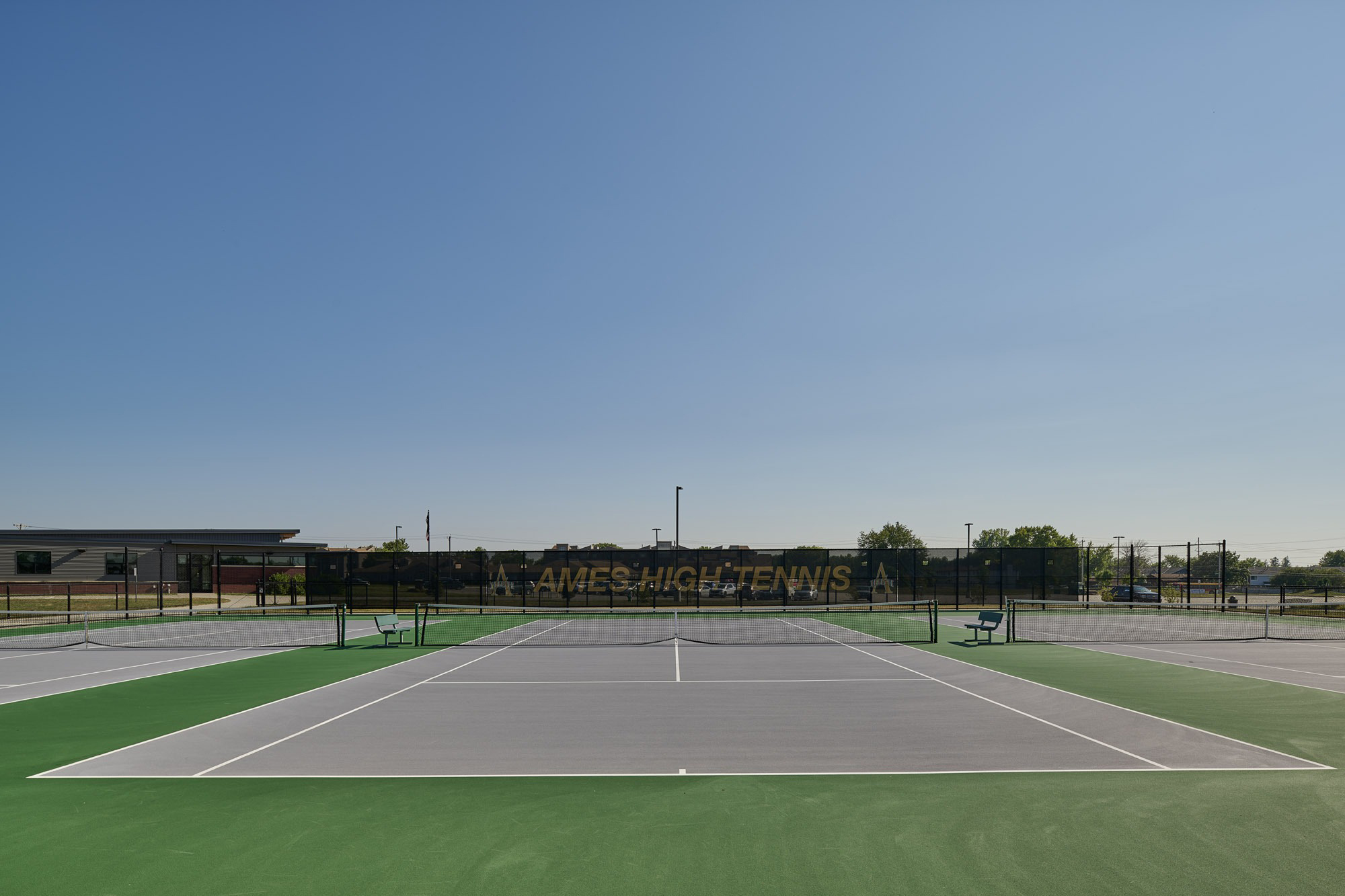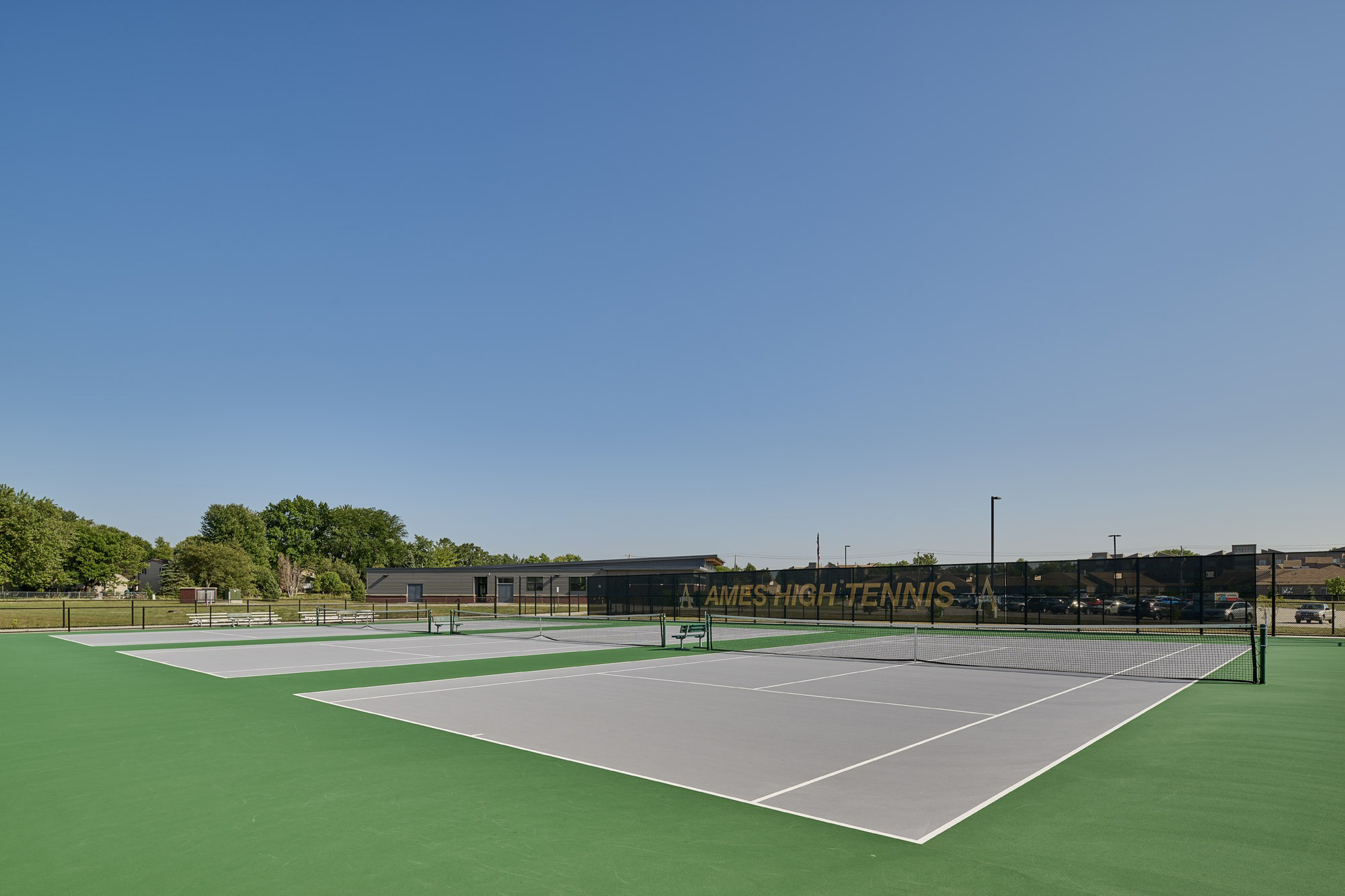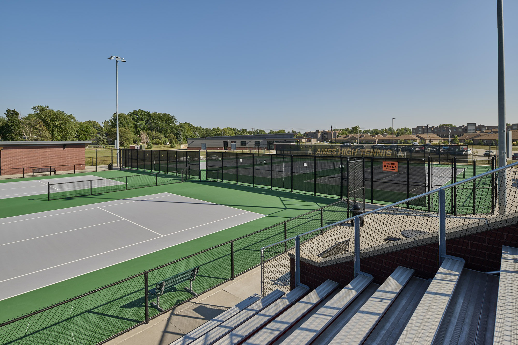 The Ames High School Tennis Court Complex was the last piece of the master plan for the Ames Community School District 24th Street Administration and Athletic Complex project. The tennis courts complement previously constructed softball and baseball practice and competition fields, a practice cross country track, a central commons plaza, and a concessions and restroom building. The tennis court complex is an eight-court complex designed for competitive tournament play. The facility is equipped with bleachers, a heated team break room, a covered team meeting area, filtered water bottle fillers, and ample lockable storage for meet day preparations. The LED flood lighting and full-height windscreens allow play at nighttime and during windy days, extending practice time and competition windows.