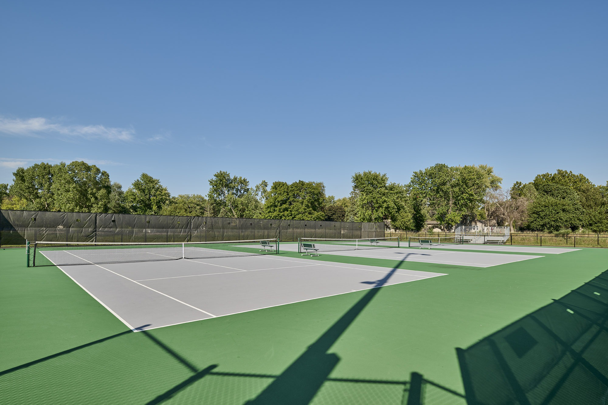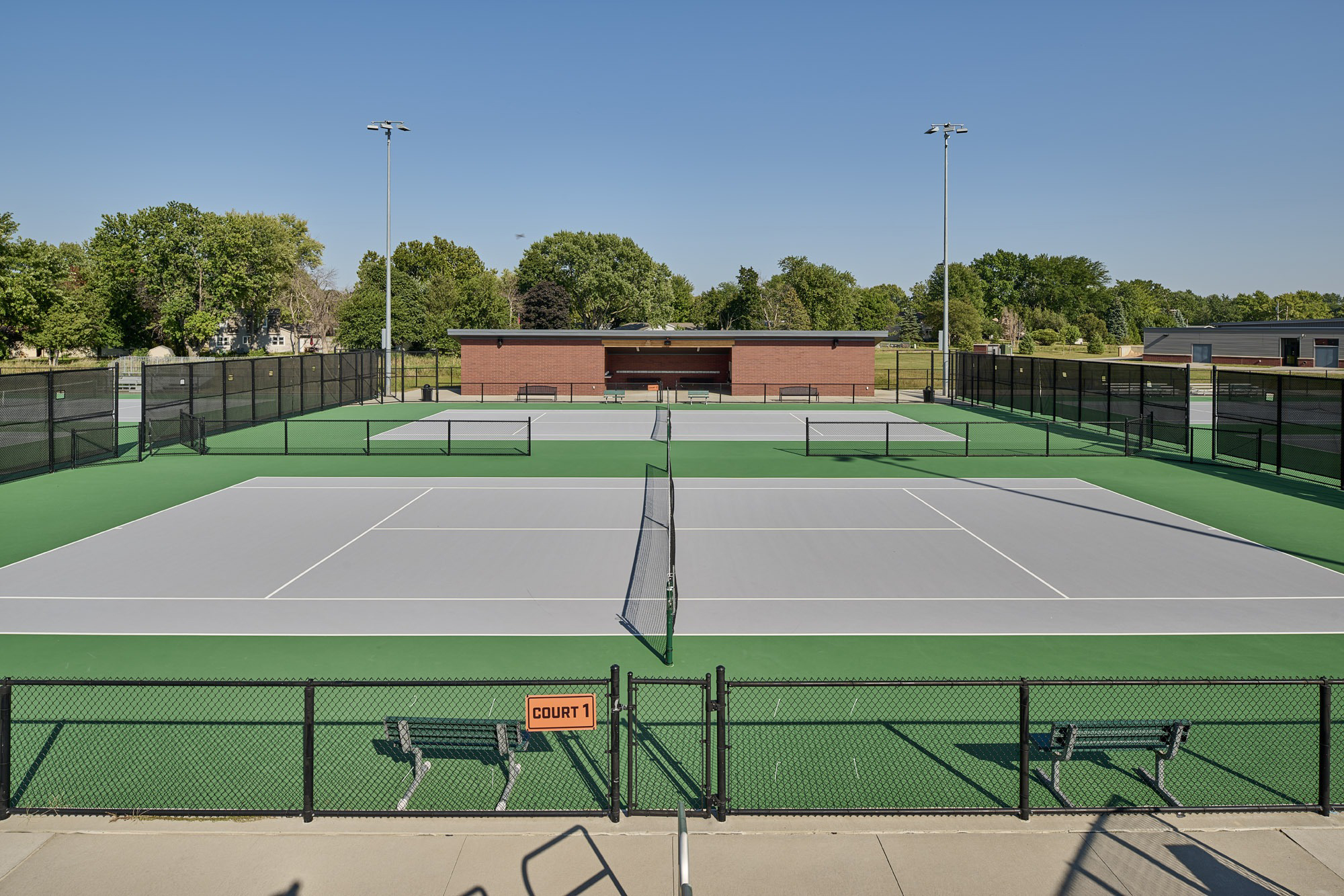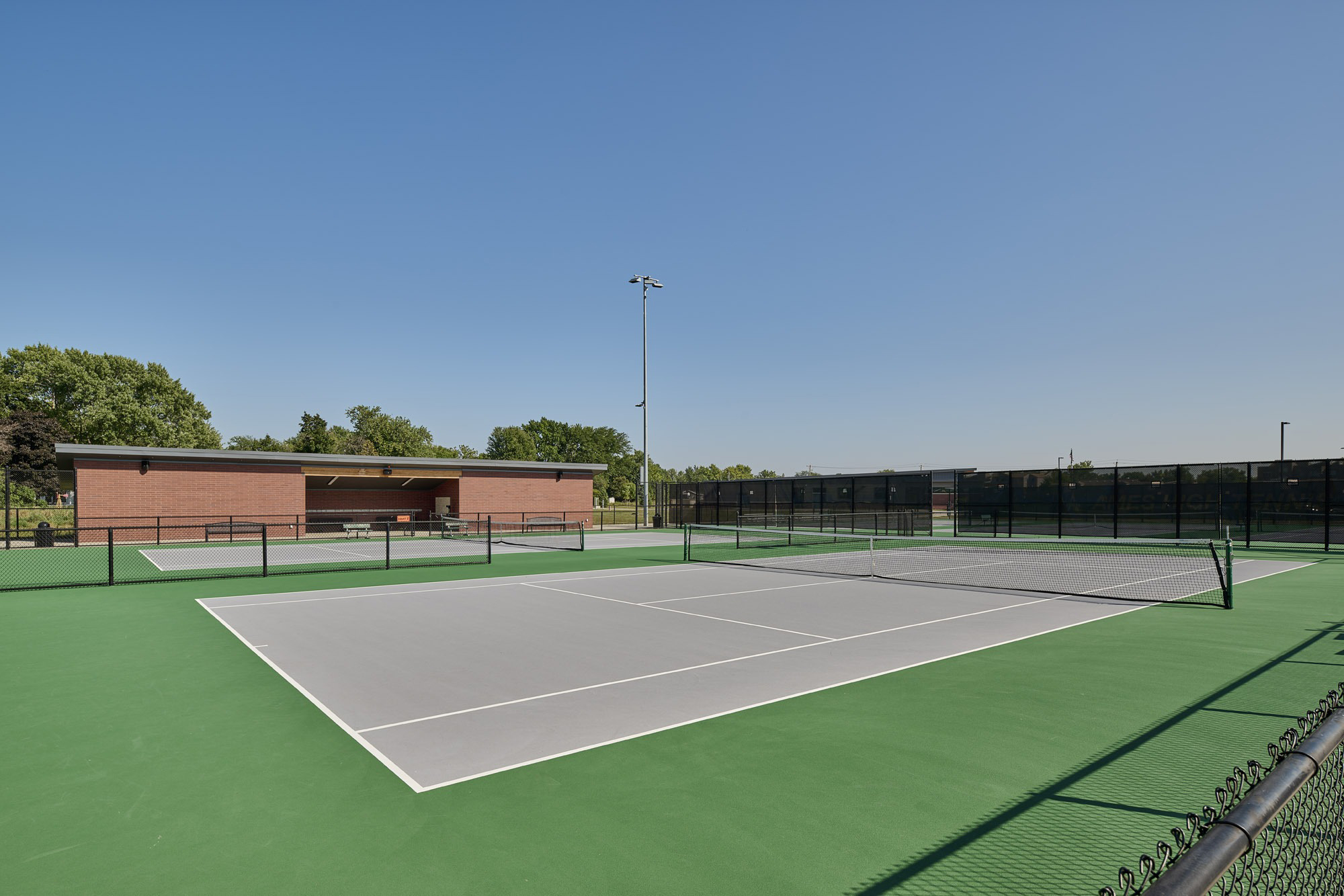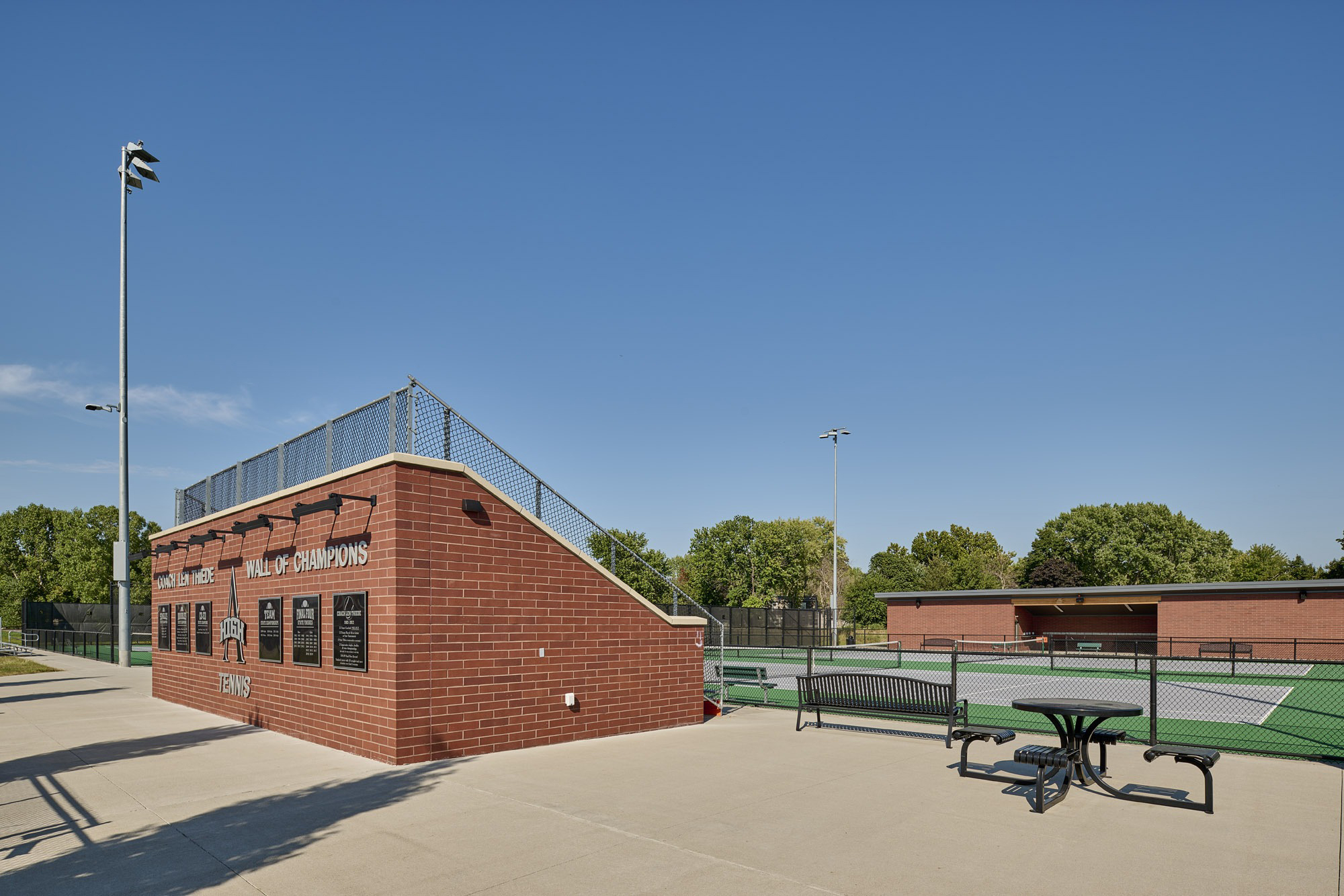 The Ames High School Tennis Court Complex was the last piece of the master plan for the Ames Community School District 24th Street Administration and Athletic Complex project. The tennis courts complement previously constructed softball and baseball practice and competition fields, a practice cross country track, a central commons plaza, and a concessions and restroom building. The tennis court complex is an eight-court complex designed for competitive tournament play. The facility is equipped with bleachers, a heated team break room, a covered team meeting area, filtered water bottle fillers, and ample lockable storage for meet day preparations. The LED flood lighting and full-height windscreens allow play at nighttime and during windy days, extending practice time and competition windows.