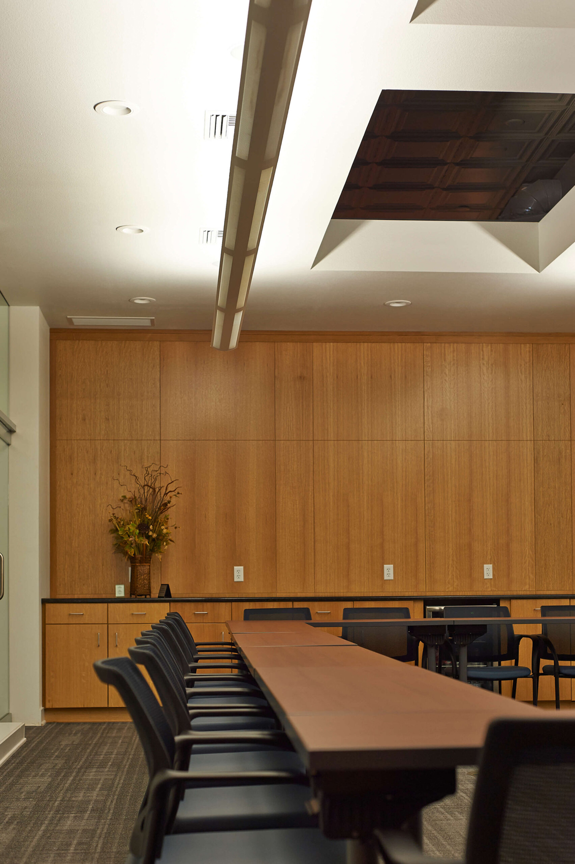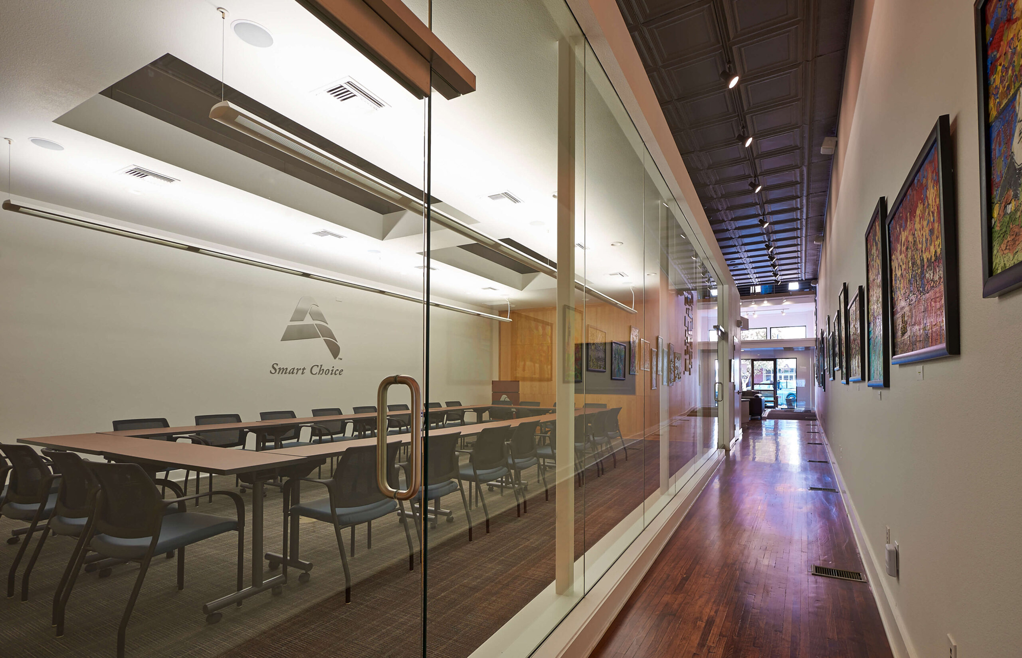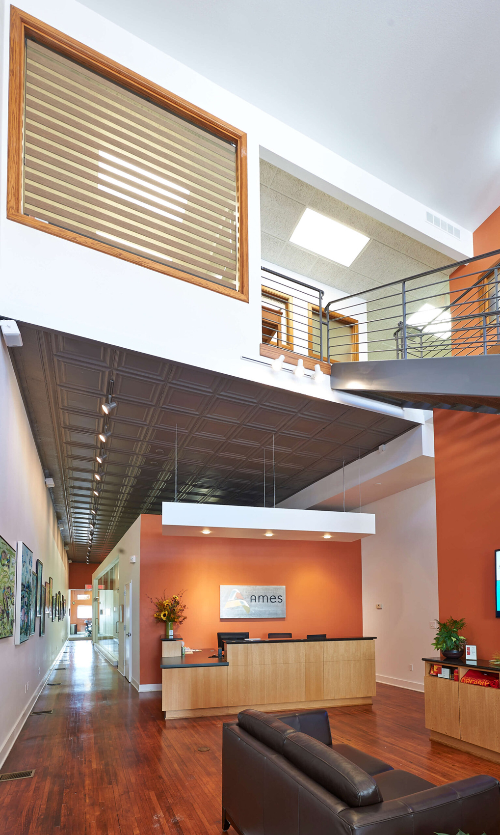 The modern conference/board room on the main level utilizes traditional material in white oak casework and accent walls, set in juxtaposition to the contemporary all-glass corridor walls. The partial height walls of the board room and “portal” ceilings expose and celebrate the historic tin ceiling. The overall effect is a modern and contemporary interior design that respects the historic character of the building, reflective of the traditional yet progressive values of the Ames Alliance.