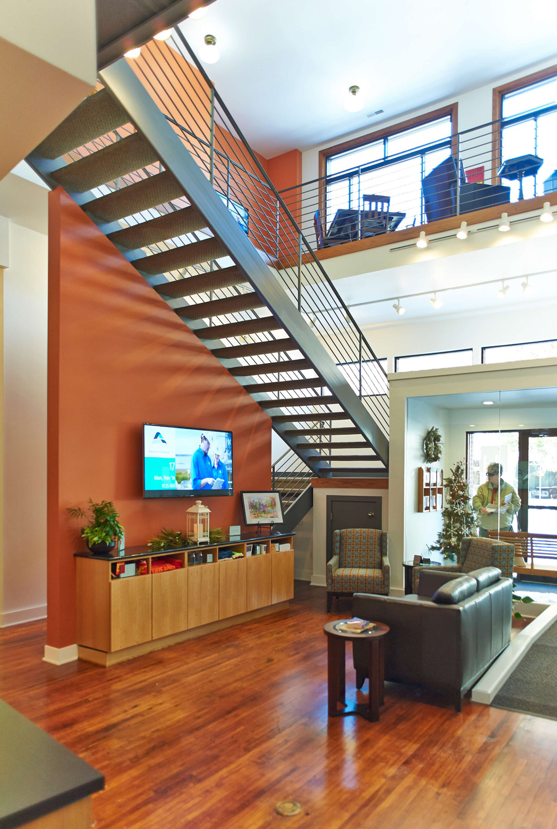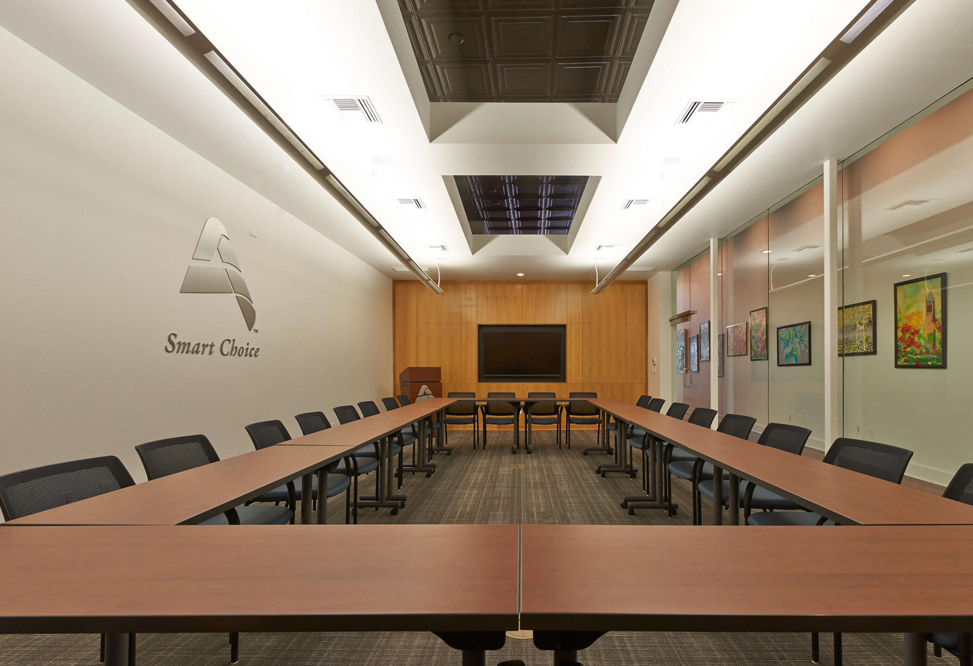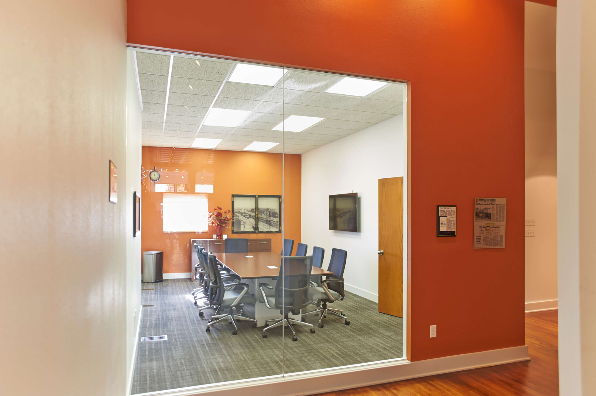 The modern conference/board room on the main level utilizes traditional material in white oak casework and accent walls, set in juxtaposition to the contemporary all-glass corridor walls. The partial height walls of the board room and “portal” ceilings expose and celebrate the historic tin ceiling. The overall effect is a modern and contemporary interior design that respects the historic character of the building, reflective of the traditional yet progressive values of the Ames Alliance.
