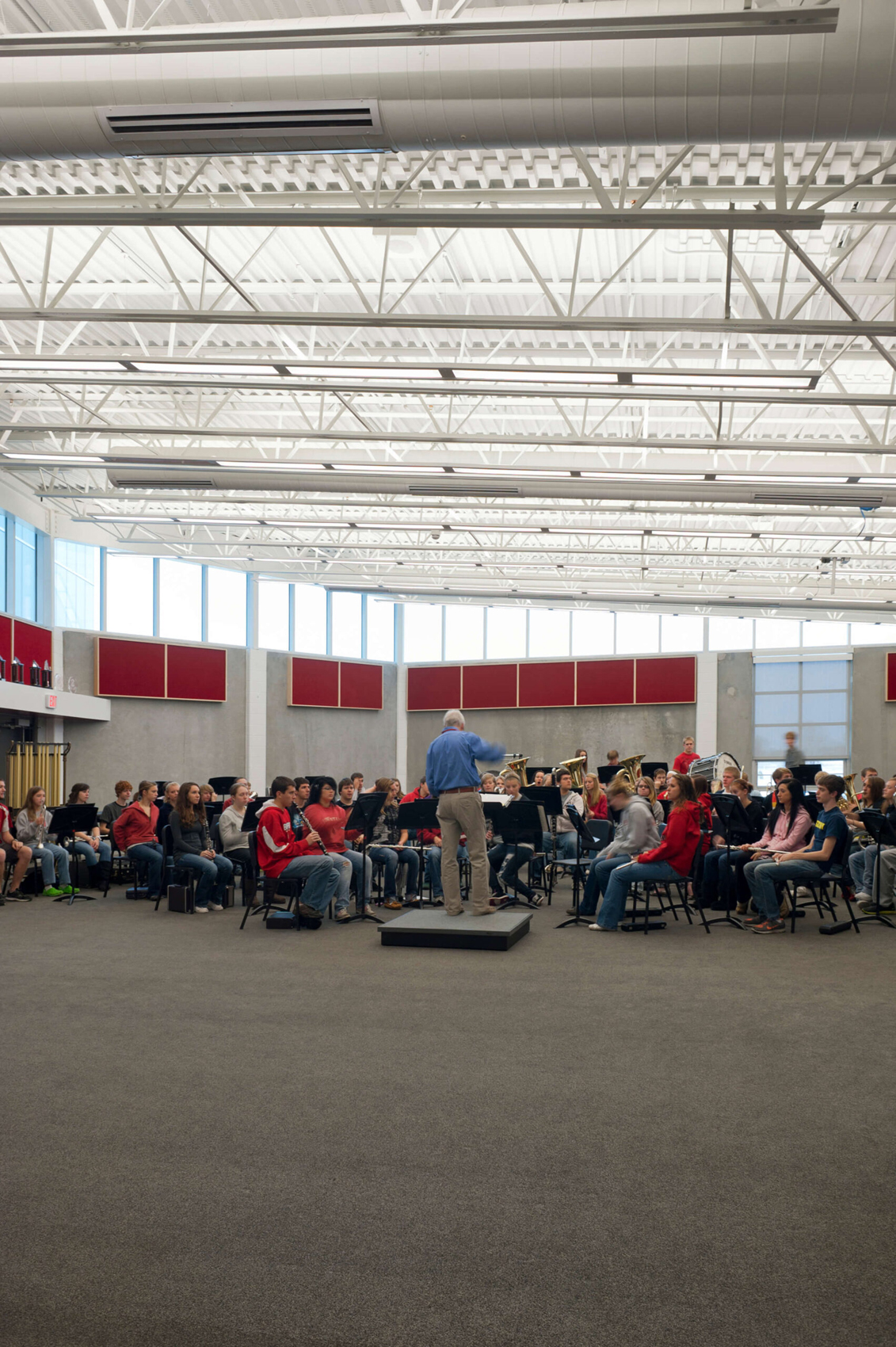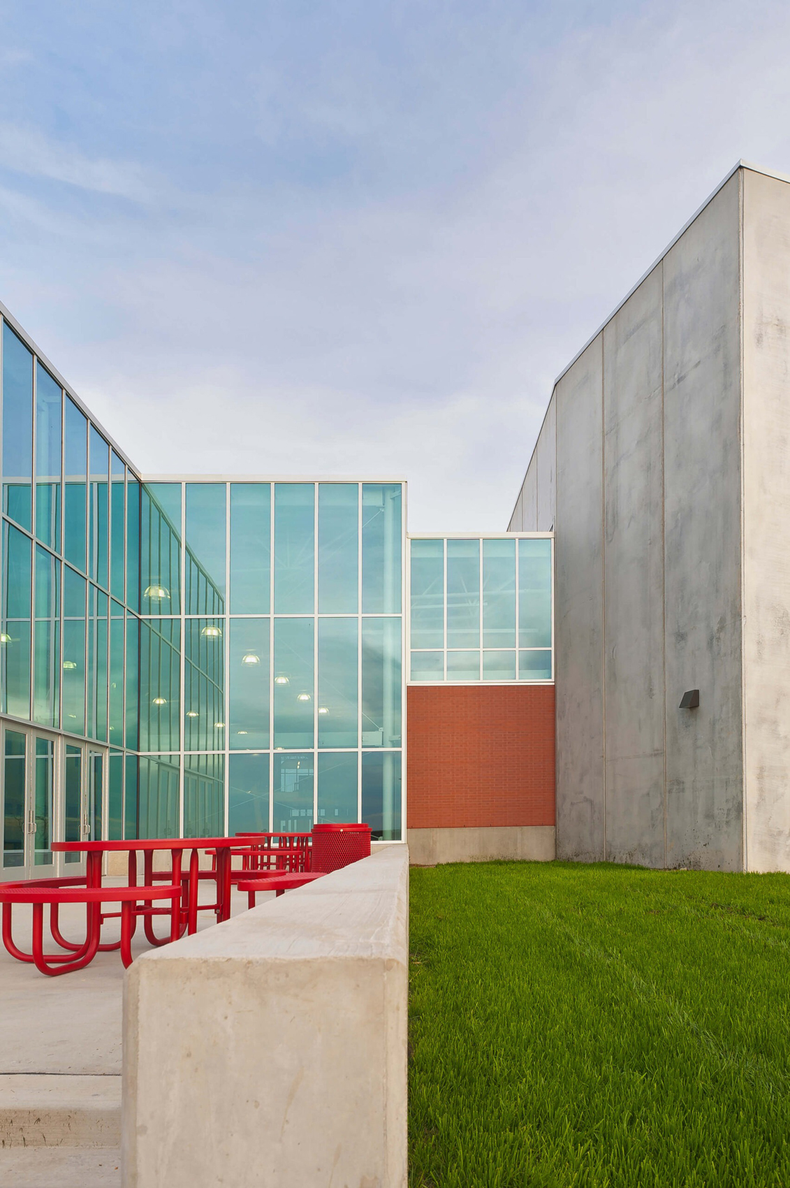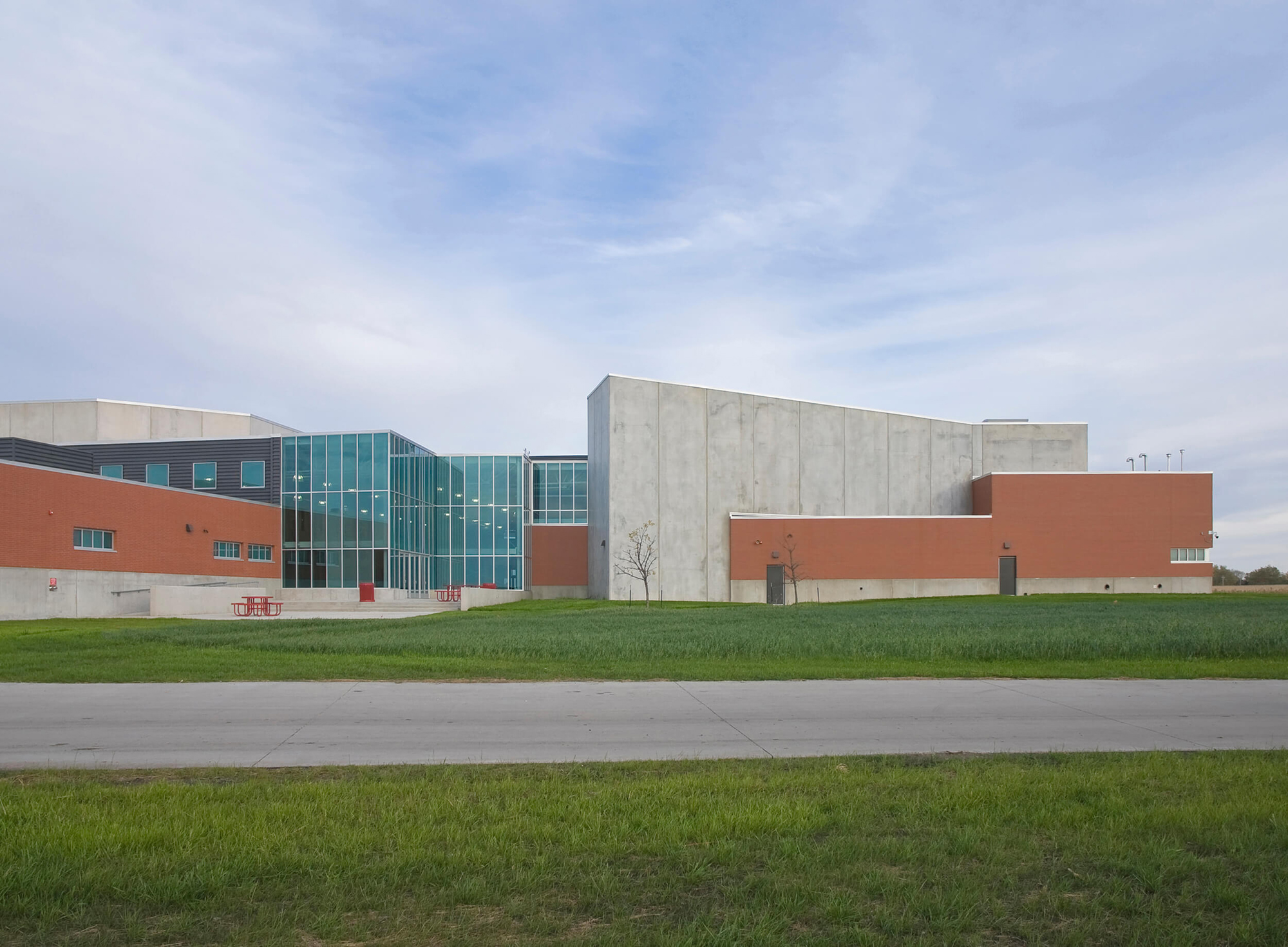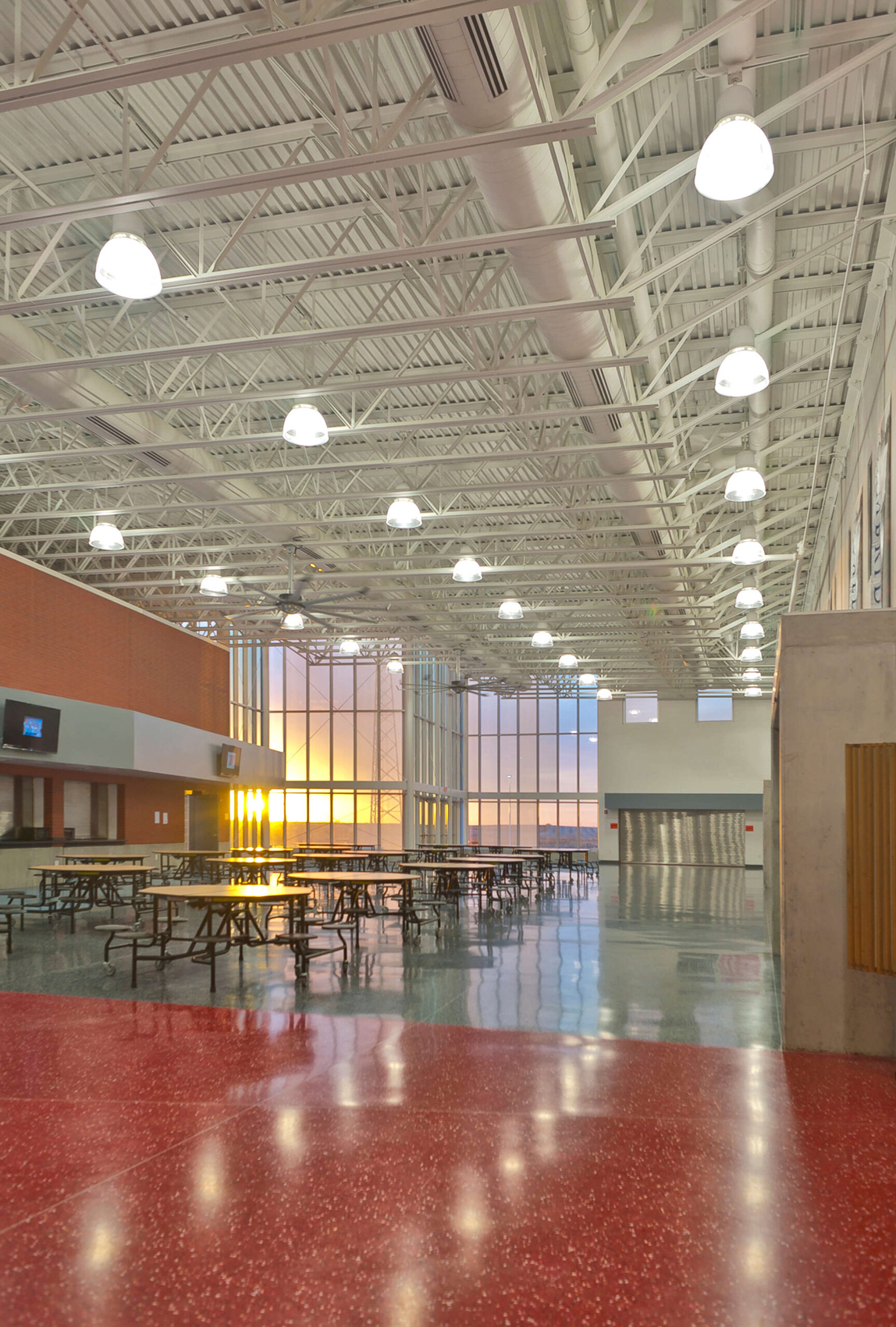 In light of the Ballard school district’s increased growth, the need for a new high school presented an opportunity to completely reinvent the educational and civic environment of the community. Presuppositions about how a high school should work and what it should look like were discarded early in the programming phase, allowing the design to evolve and change to meet the needs and vision of the district. Being sited on the edge of town and clearly visible for miles around, it was imperative that the new high school create an iconic image indicative of the progressive mentality of the district. In striking contrast to the agricultural backdrop, the curtain walled facade of the media center coupled with the red brick and precast concrete walls creates an iconic and distinctly modern architecture in the rural landscape. Flooded by daylight, the commons serves as a community gathering space for community events in the adjacent auditorium, band/vocal rooms, media center, and gymnasium.