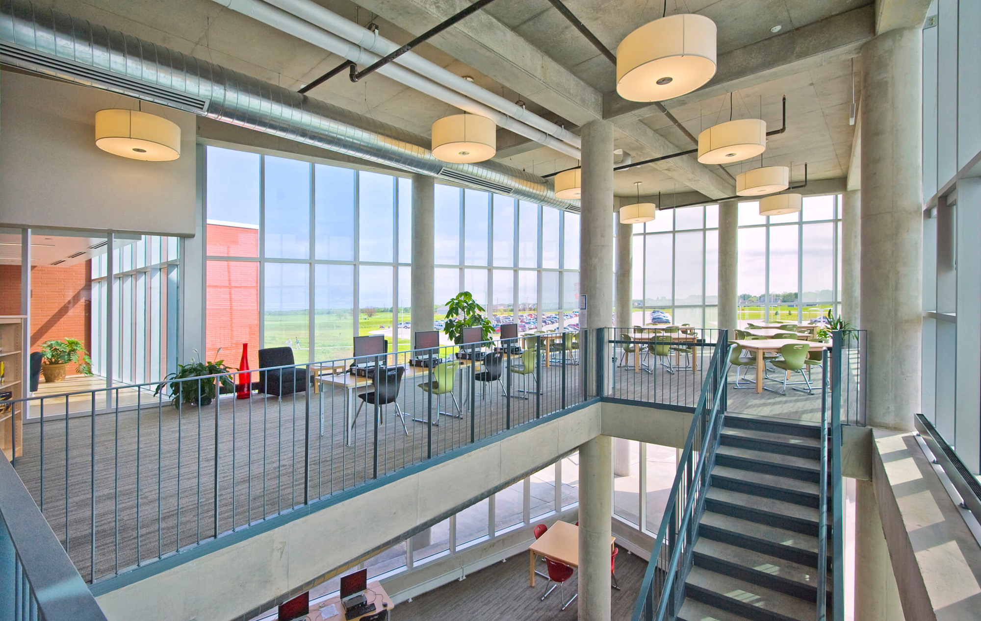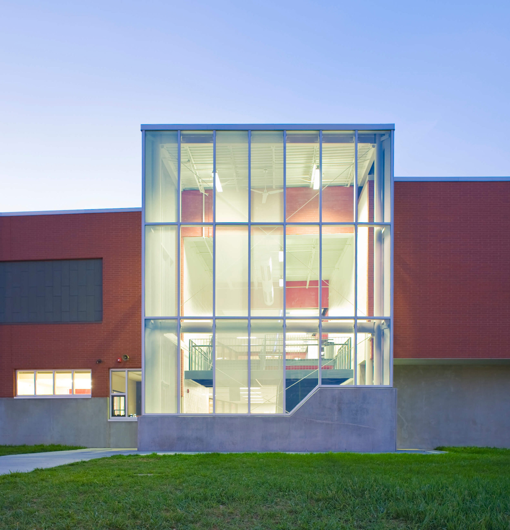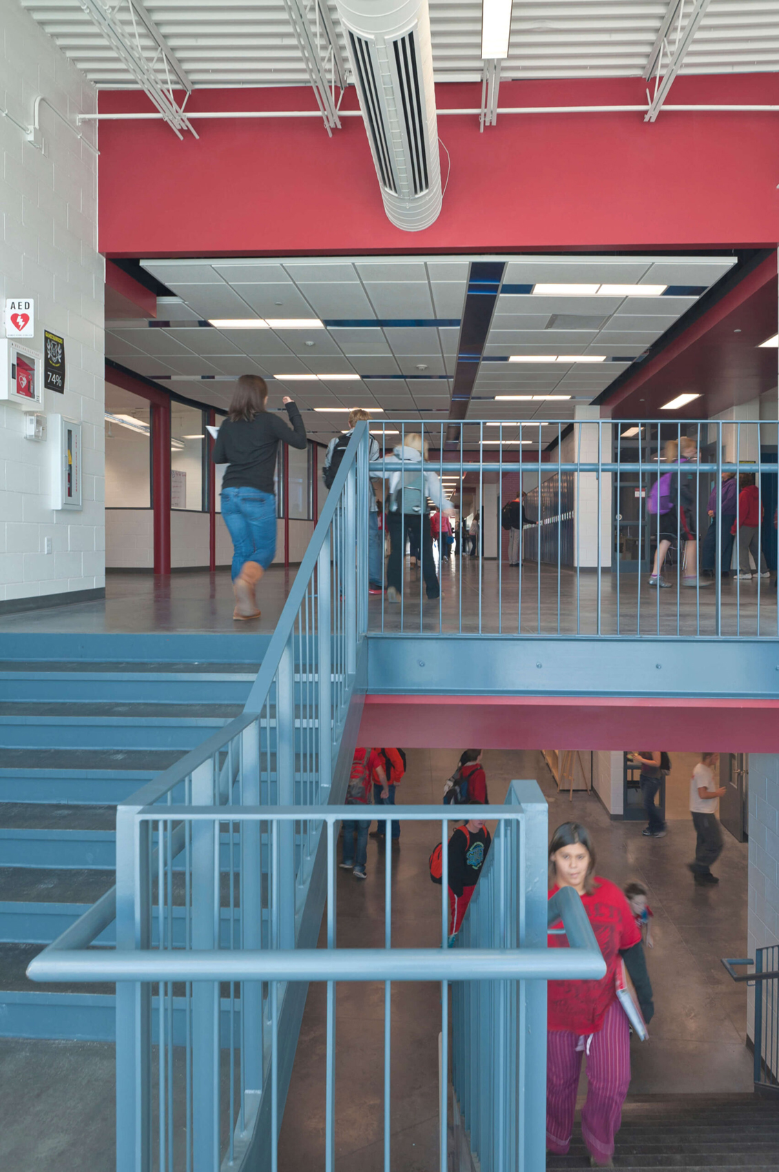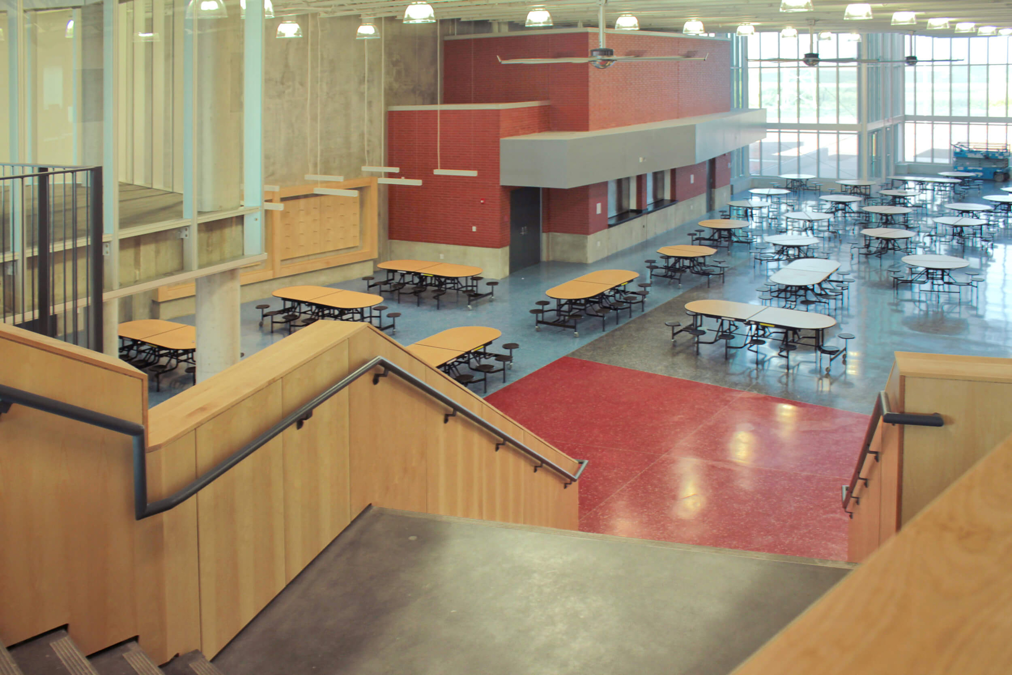 In light of the Ballard school district’s increased growth, the need for a new high school presented an opportunity to completely reinvent the educational and civic environment of the community. Presuppositions about how a high school should work and what it should look like were discarded early in the programming phase, allowing the design to evolve and change to meet the needs and vision of the district. Being sited on the edge of town and clearly visible for miles around, it was imperative that the new high school create an iconic image indicative of the progressive mentality of the district. In striking contrast to the agricultural backdrop, the curtain walled facade of the media center coupled with the red brick and precast concrete walls creates an iconic and distinctly modern architecture in the rural landscape. Flooded by daylight, the commons serves as a community gathering space for community events in the adjacent auditorium, band/vocal rooms, media center, and gymnasium.