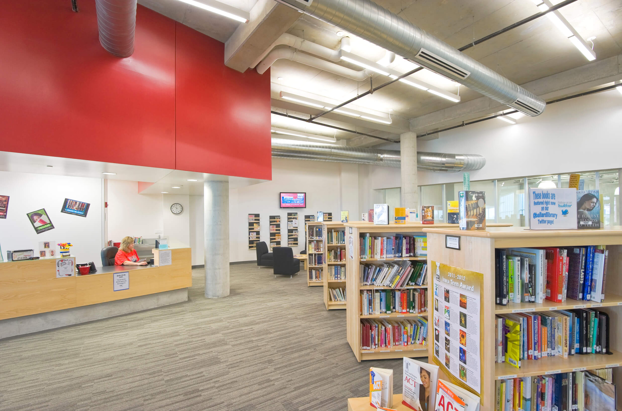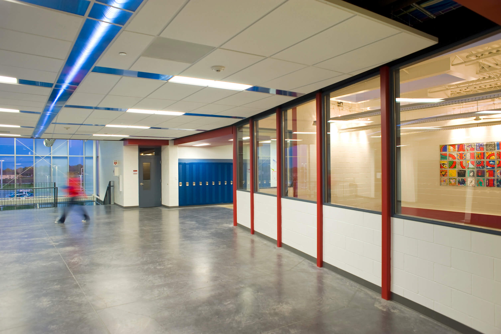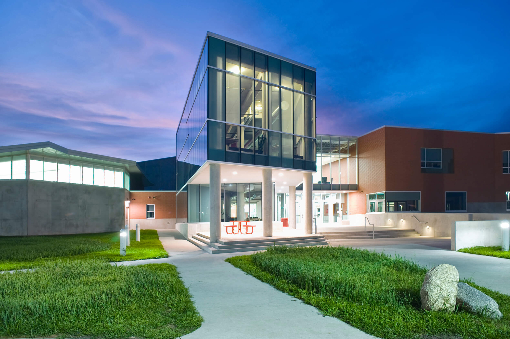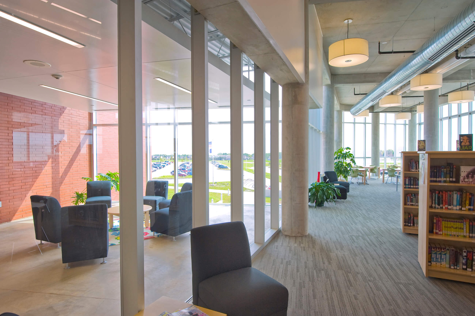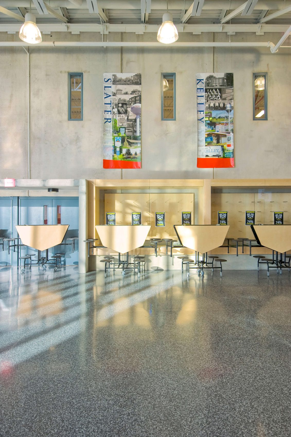 In light of the Ballard school district’s increased growth, the need for a new high school presented an opportunity to completely reinvent the educational and civic environment of the community. Presuppositions about how a high school should work and what it should look like were discarded early in the programming phase, allowing the design to evolve and change to meet the needs and vision of the district. Being sited on the edge of town and clearly visible for miles around, it was imperative that the new high school create an iconic image indicative of the progressive mentality of the district. In striking contrast to the agricultural backdrop, the curtain walled facade of the media center coupled with the red brick and precast concrete walls creates an iconic and distinctly modern architecture in the rural landscape. Flooded by daylight, the commons serves as a community gathering space for community events in the adjacent auditorium, band/vocal rooms, media center, and gymnasium.