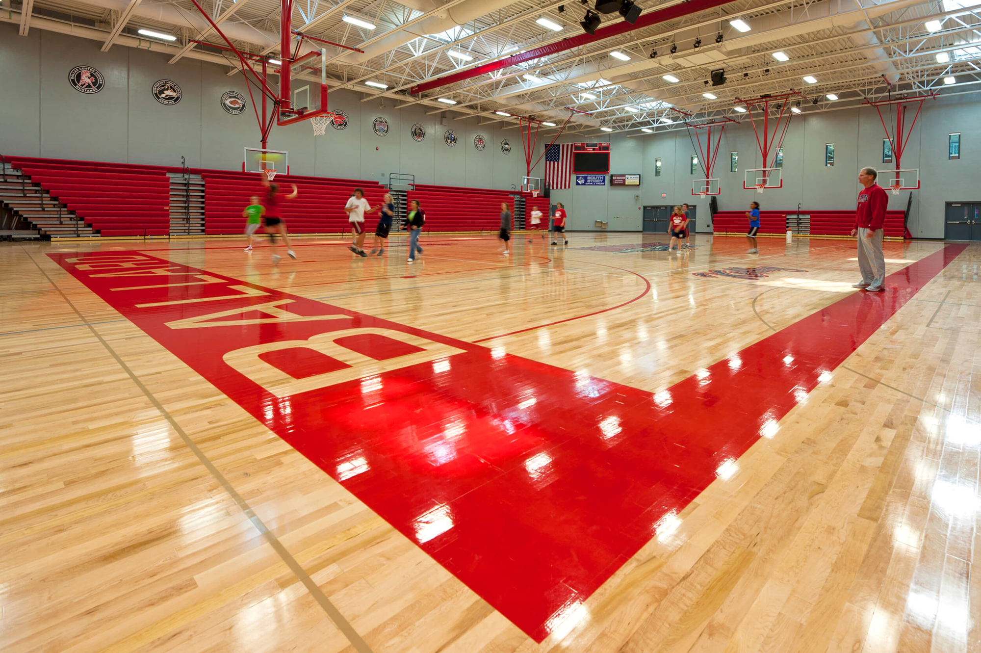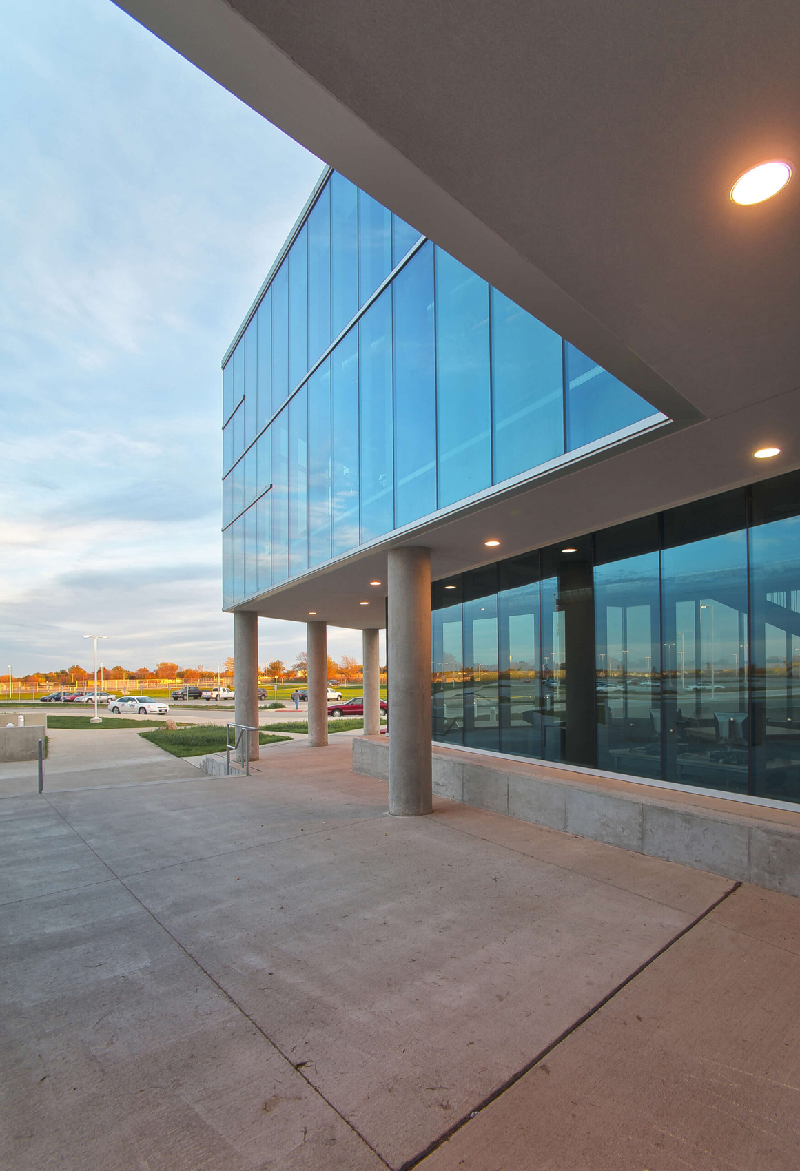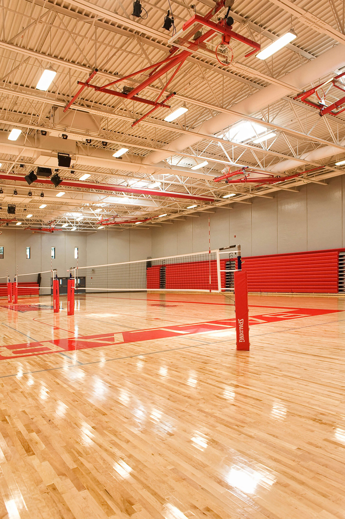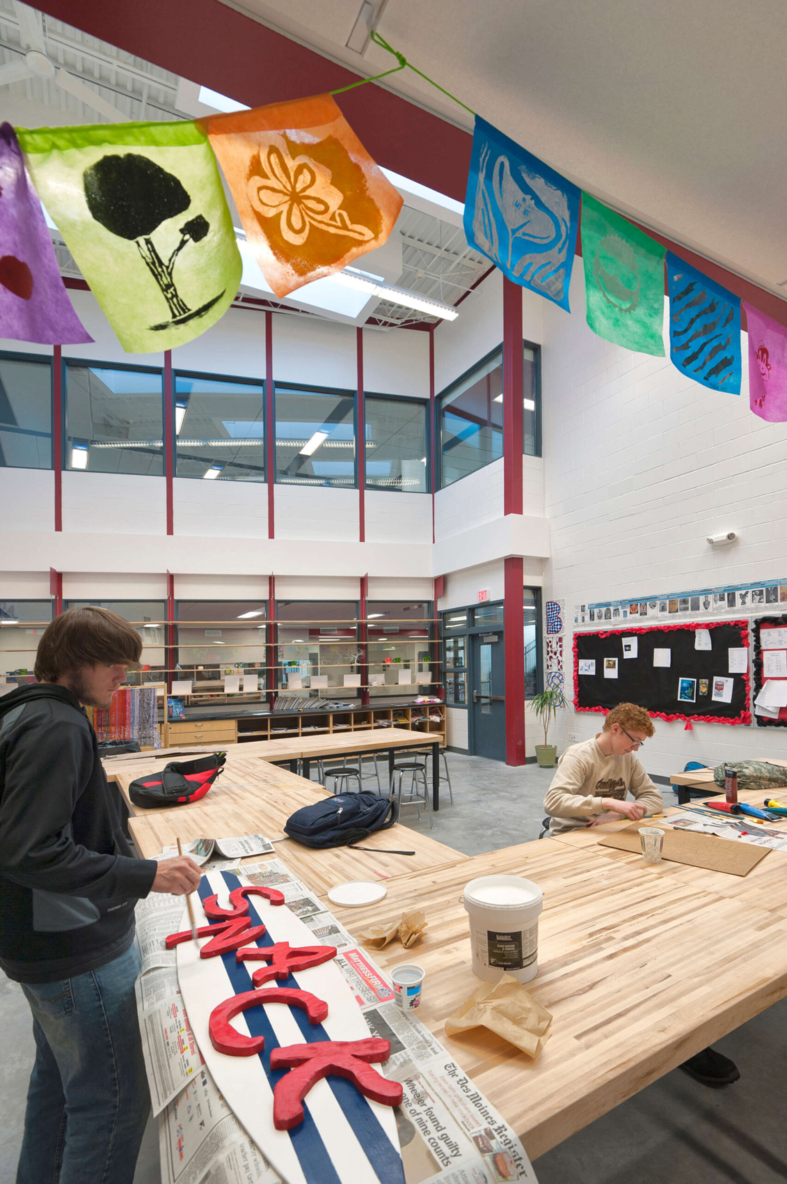 In light of the Ballard school district’s increased growth, the need for a new high school presented an opportunity to completely reinvent the educational and civic environment of the community. Presuppositions about how a high school should work and what it should look like were discarded early in the programming phase, allowing the design to evolve and change to meet the needs and vision of the district. Being sited on the edge of town and clearly visible for miles around, it was imperative that the new high school create an iconic image indicative of the progressive mentality of the district. In striking contrast to the agricultural backdrop, the curtain walled facade of the media center coupled with the red brick and precast concrete walls creates an iconic and distinctly modern architecture in the rural landscape. Flooded by daylight, the commons serves as a community gathering space for community events in the adjacent auditorium, band/vocal rooms, media center, and gymnasium.