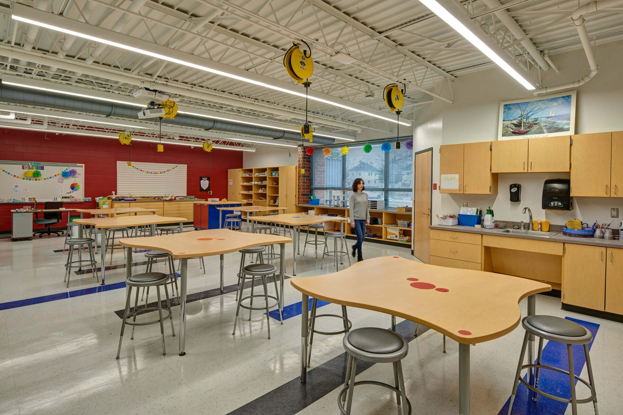 Project successes include the incorporation of natural light into all learning spaces, the creation of multiple outdoor gathering spaces, and the integration of sustainable design practices via improved building envelope, mechanical, electrical and plumbing systems. A phased construction strategy was implemented to allow for construction to occur simultaneously with school activities.