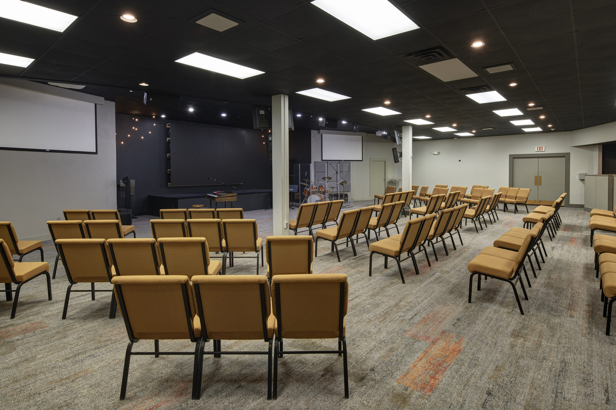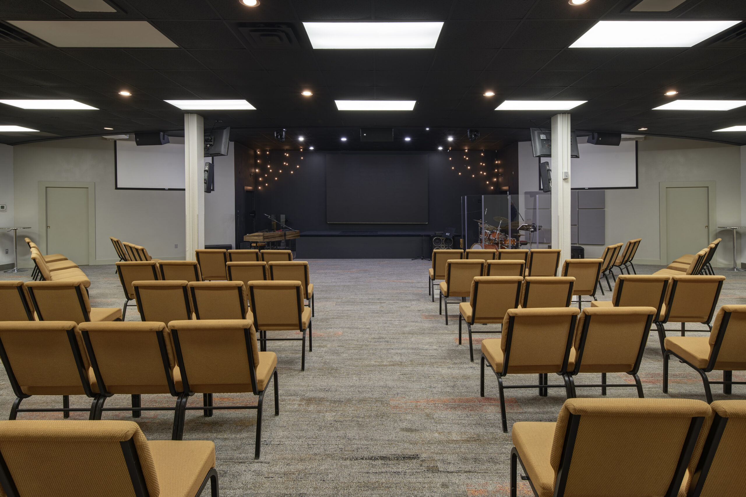 The goal of the worship space renovation was to transform the interior experience to a more intimate one through a deeper color palette and the ability to reconfigure the arrangement of furniture and worship components. The new flooring, finishes, and colors create a contemporary backdrop for the worship space.