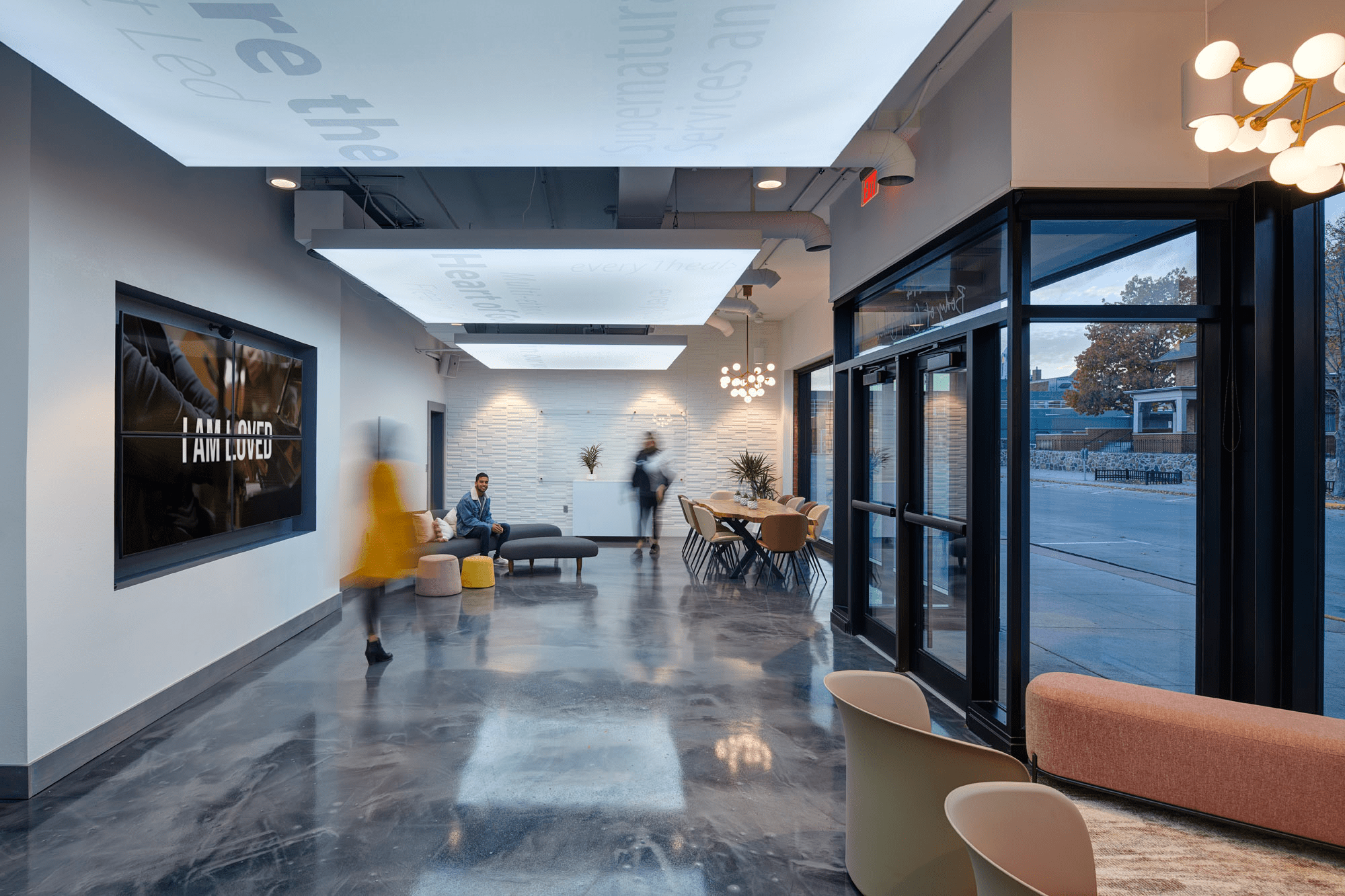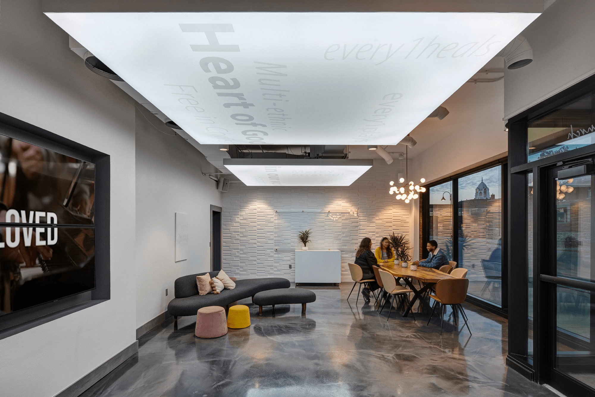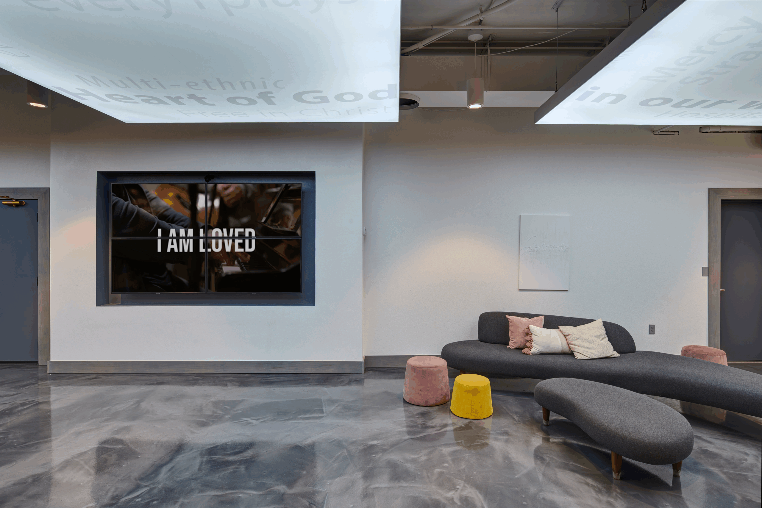 Body of Christ Church’s vision was to redesign their space in a way that reflects their core values. The renovated lobby improves upon the previously closed off entry to a space that is now open and highly visible from the exterior. It serves as a flexible and welcoming space for church members and staff trademarked with new furniture and unconventional design features. The church’s core values are incorporated into illuminated, suspended ceiling elements, and are revealed to a user upon entering the space.