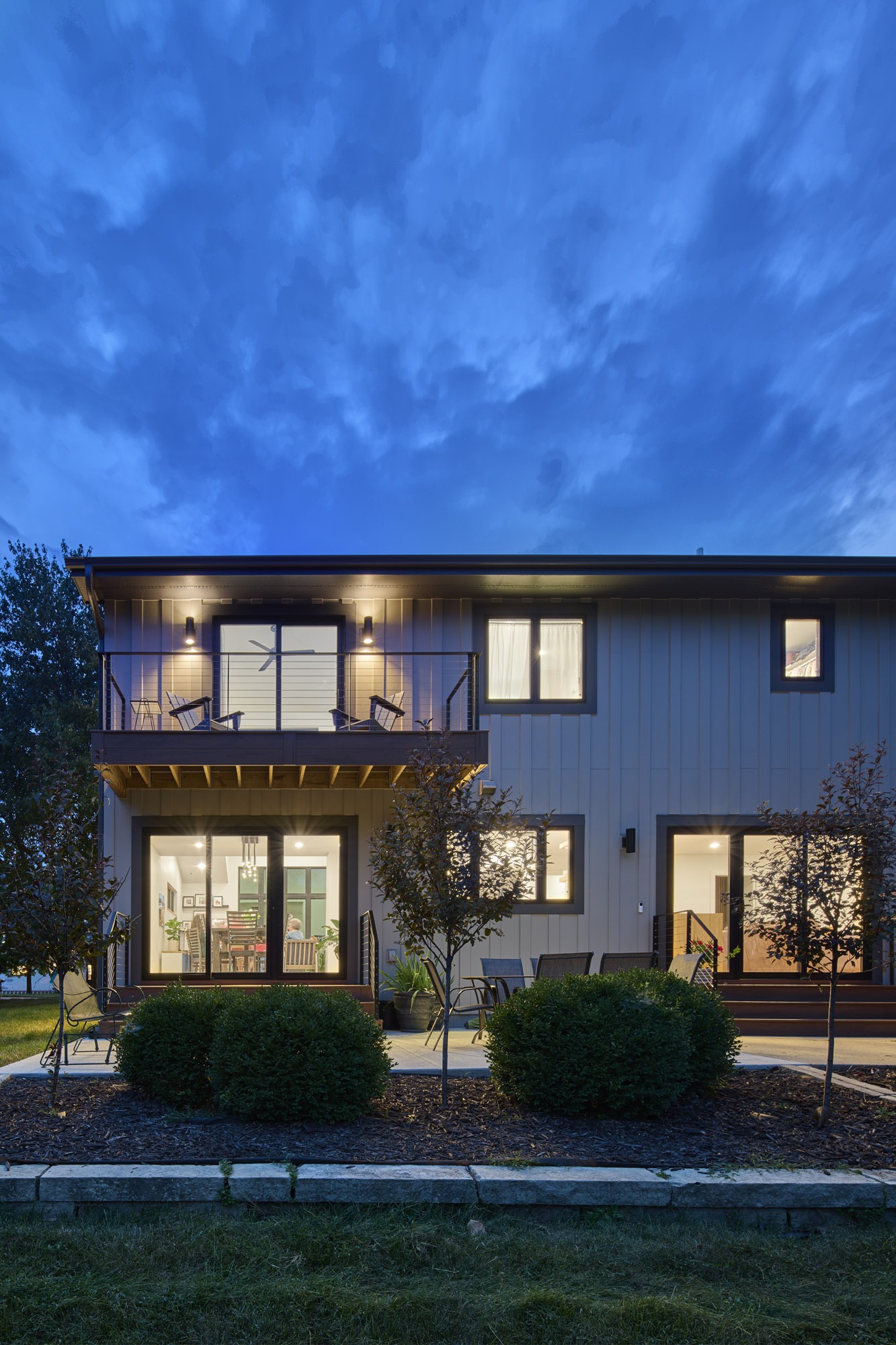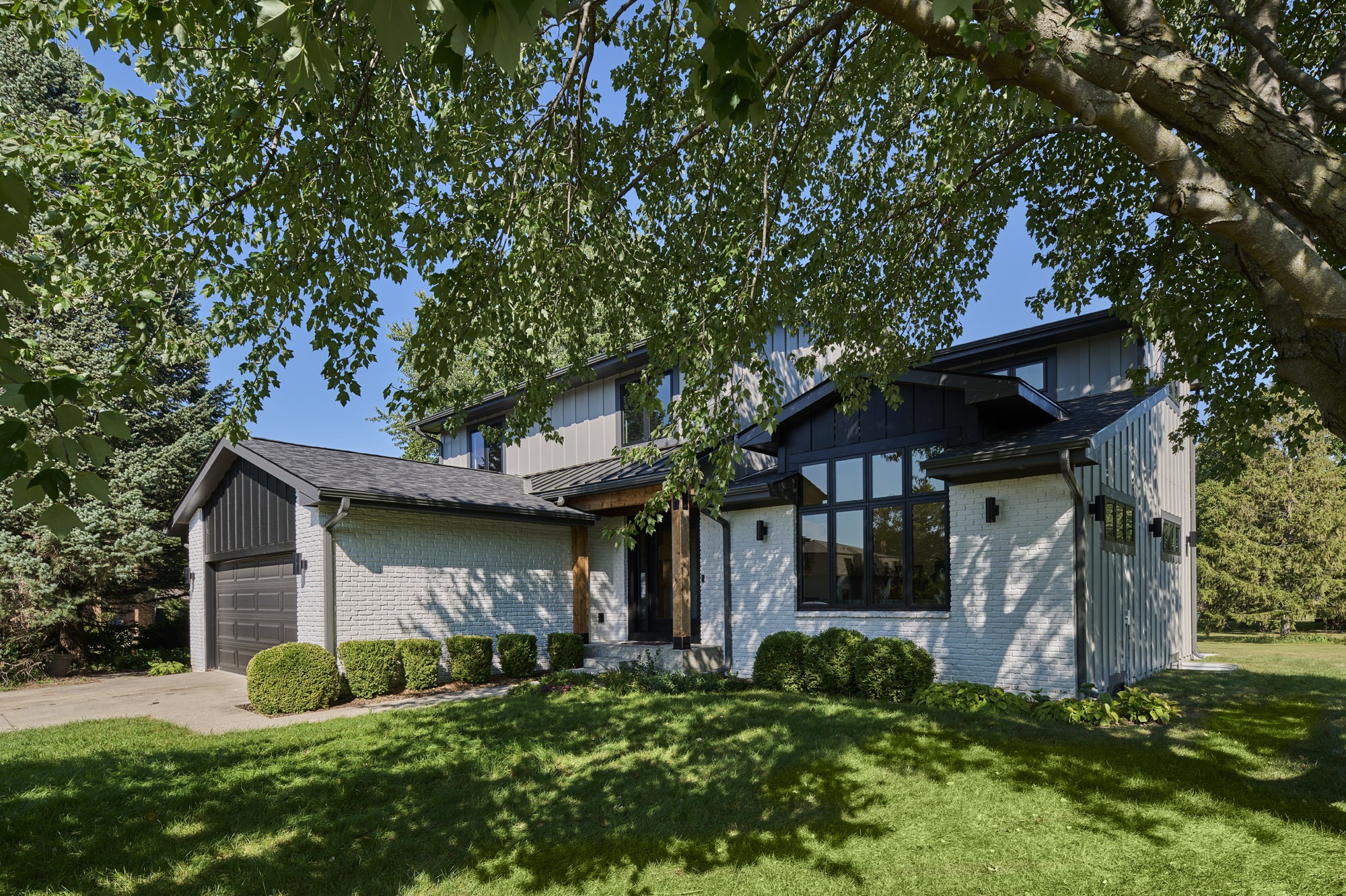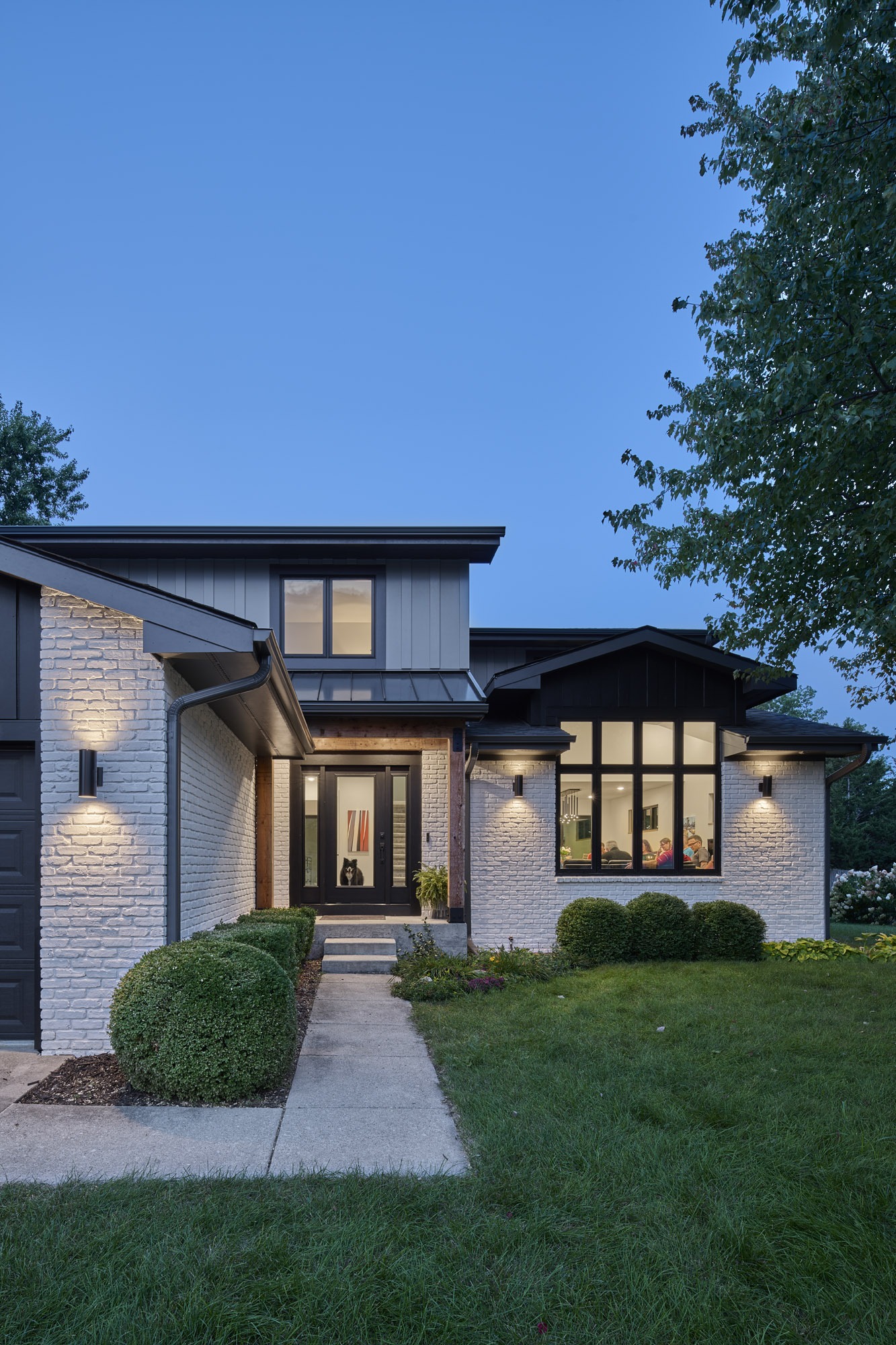 The contrasting painted board and batten siding, brick, and heavy timber materials create a bright and warm exterior. Amended roof lines, a second level addition, and increased window area proportionately balance the front elevation while opening up the interior space.