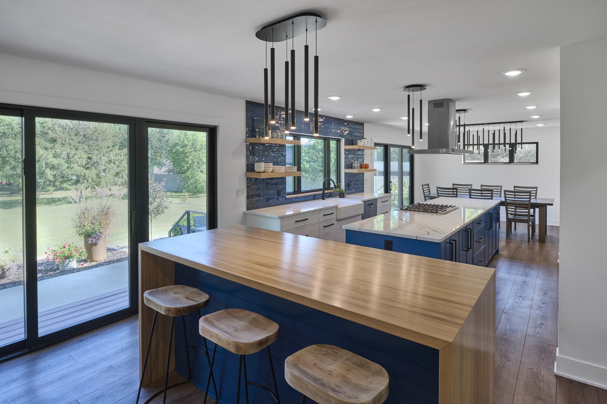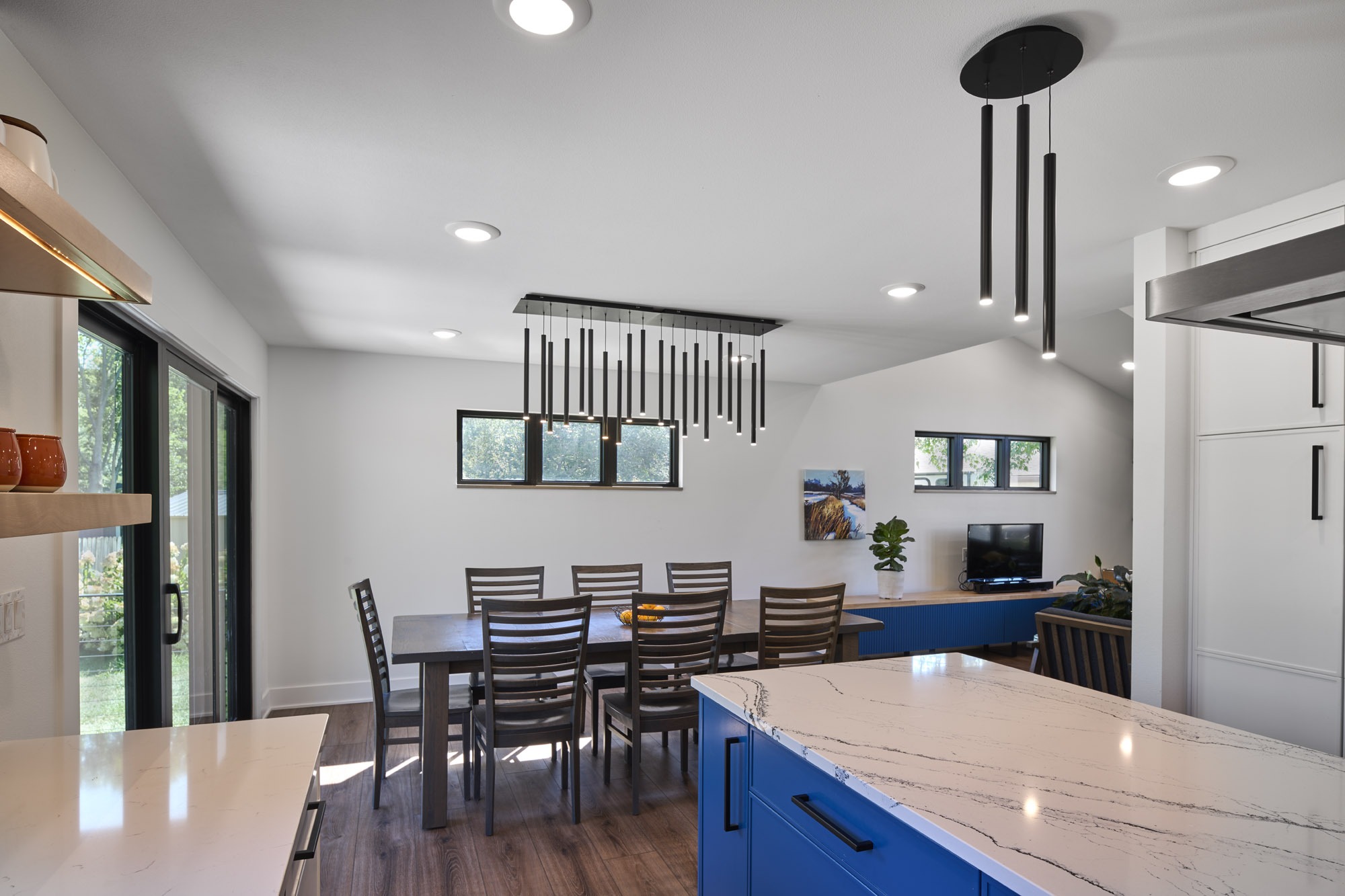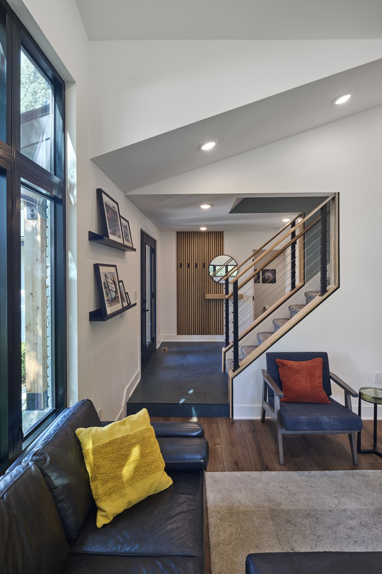 The removal of various existing walls and doors immediately creates a more welcoming entry which is open to the adjacent living space and beyond. A custom built-in feature with coat hooks, a mirror, and a shelf add to the functionality of the foyer. The increased volume of the vaulted ceiling allows for a more light filled and spacious living room. Nearly unrecognizable from the existing condition, the new kitchen, dining, and family rooms now flow freely to one another with bold and playful design touches. Warm wood accents, pops of color, and dynamic feature lighting tie together these main level spaces. The majorly reconfigured kitchen features sleek, full height cabinetry, a large basin sink with a backyard view, a stainless steel range and hood, and a butcherblock entertaining island. The open concept theme continues from the main level to the expanded patio with increased access points and large glass openings.
