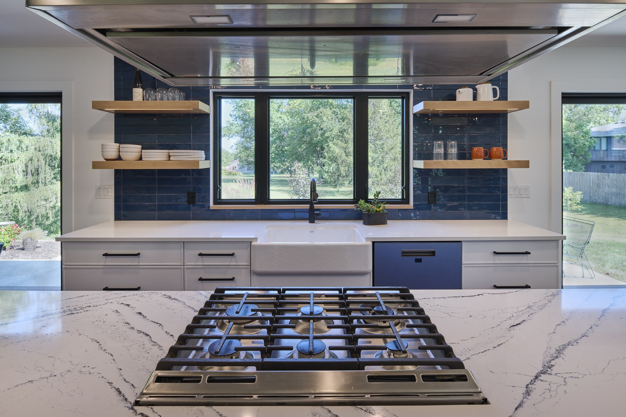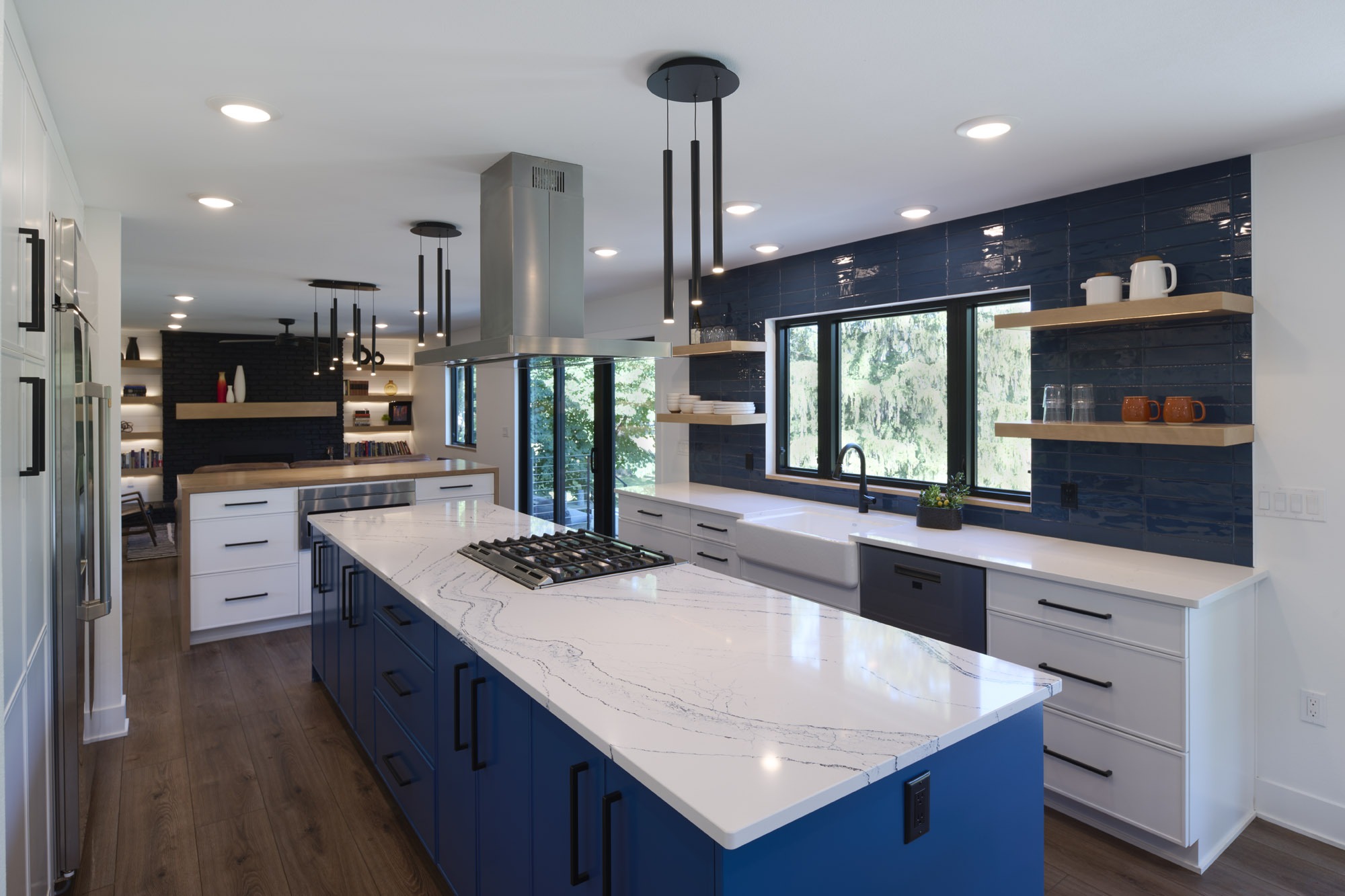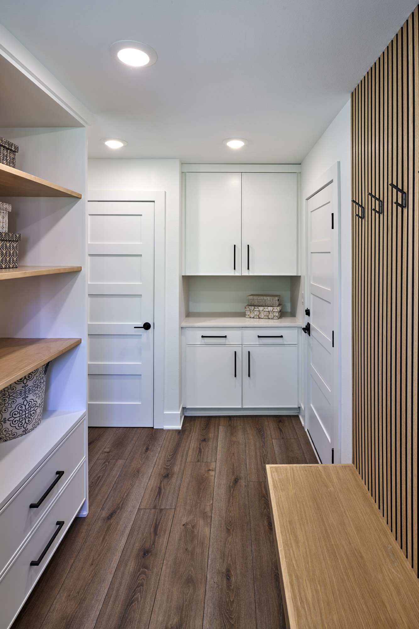 The removal of various existing walls and doors immediately creates a more welcoming entry which is open to the adjacent living space and beyond. A custom built-in feature with coat hooks, a mirror, and a shelf add to the functionality of the foyer. The increased volume of the vaulted ceiling allows for a more light filled and spacious living room. Nearly unrecognizable from the existing condition, the new kitchen, dining, and family rooms now flow freely to one another with bold and playful design touches. Warm wood accents, pops of color, and dynamic feature lighting tie together these main level spaces. The majorly reconfigured kitchen features sleek, full height cabinetry, a large basin sink with a backyard view, a stainless steel range and hood, and a butcherblock entertaining island. The open concept theme continues from the main level to the expanded patio with increased access points and large glass openings.