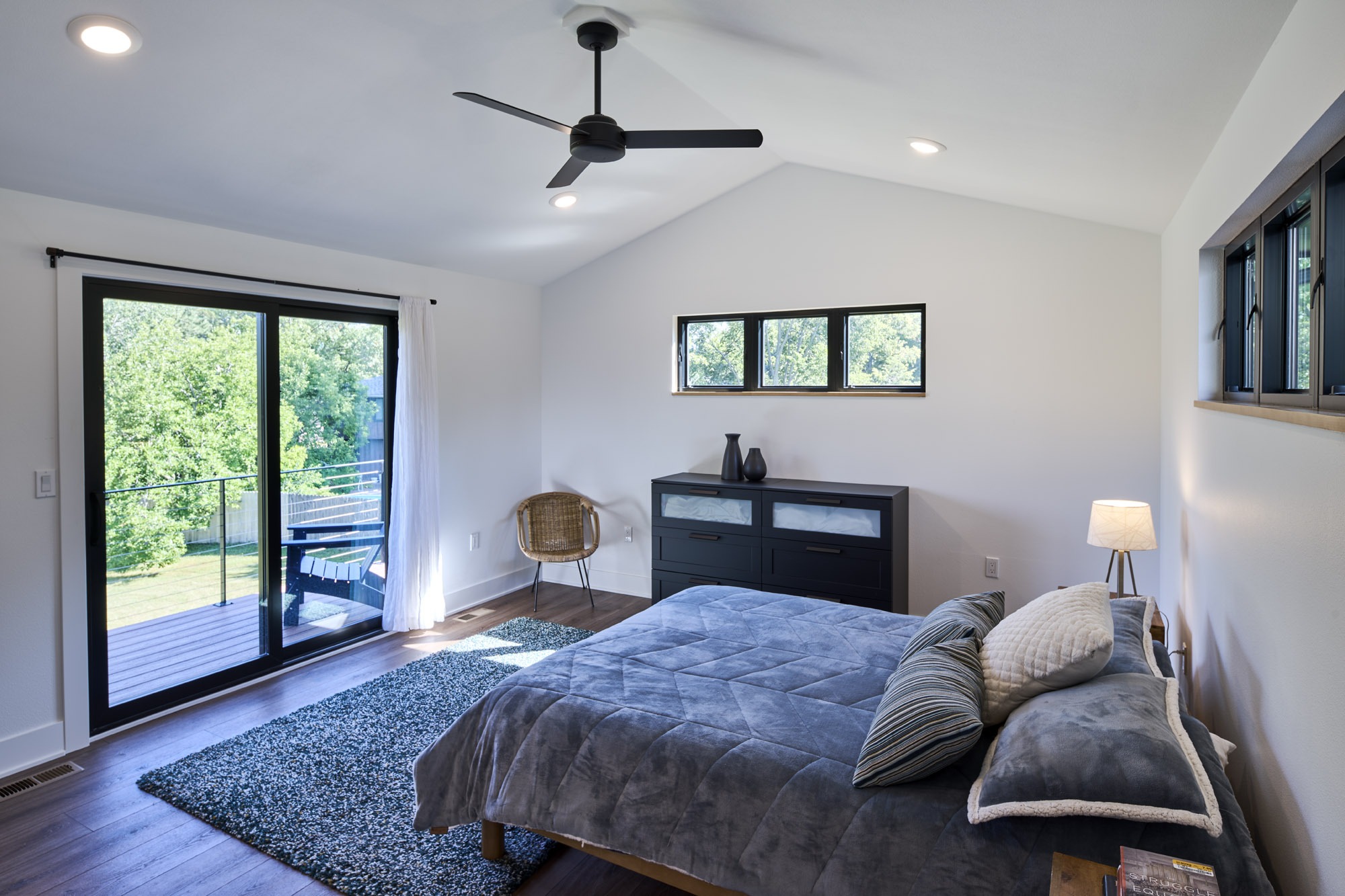The second level addition includes a new master bedroom with vaulted ceilings, ample windows, and a cantilevered private balcony overlooking the below patio and yard. The master suite also has an expanded walk-in closet, a modern double vanity, walk-in shower, and freestanding tub.