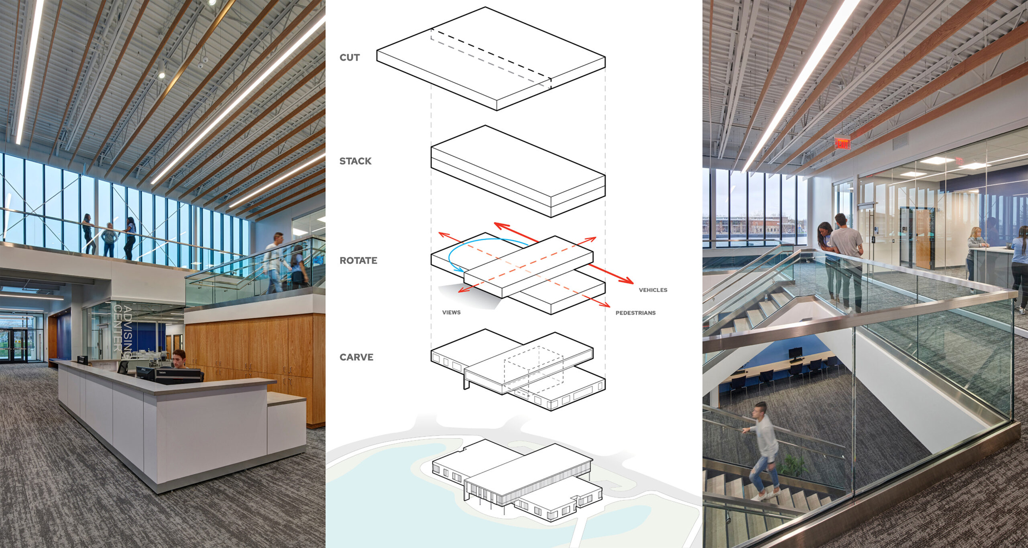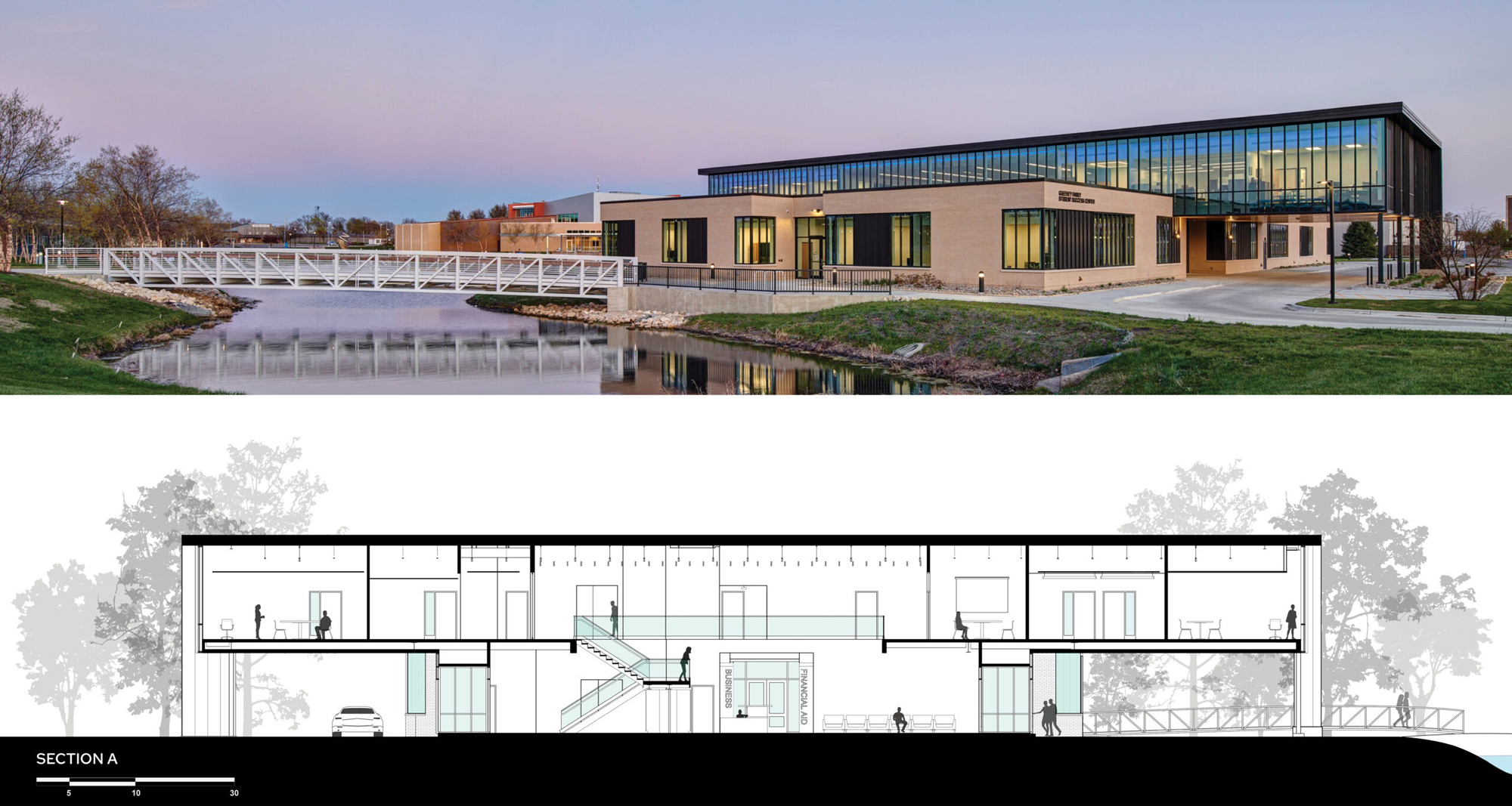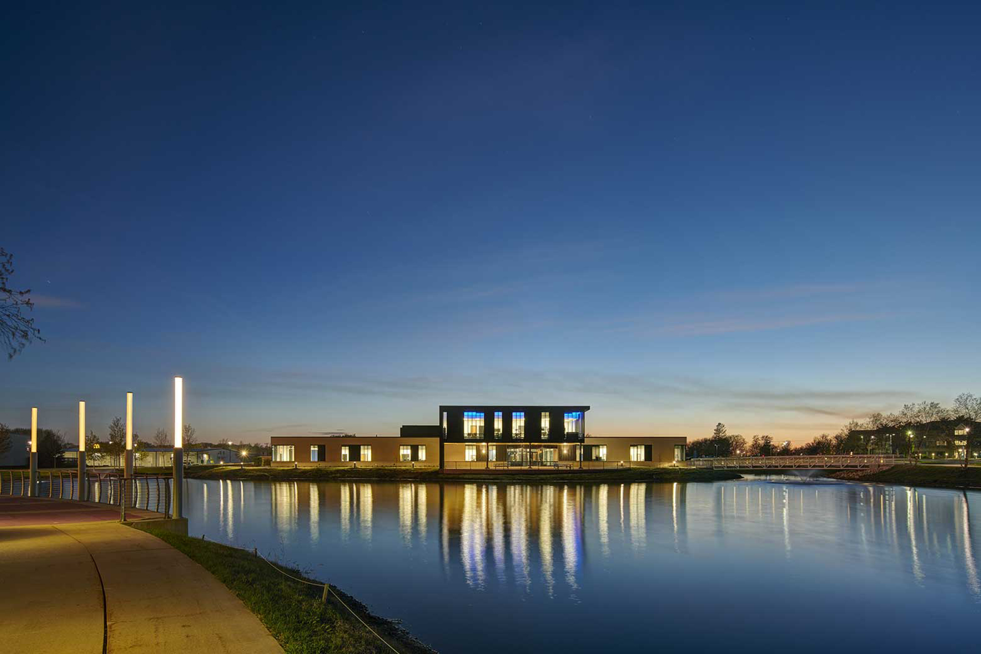 With the project site being surrounded by water on three sides, the building’s position allows for cross-axial circulation with a pedestrian bridge connecting to campus, a covered vehicle drop off, a covered patio, and prime views of the pond and campus. Daylight is harvested through northern glazing and an atrium. The atrium also serves as a wayfinding point and place of social interaction.