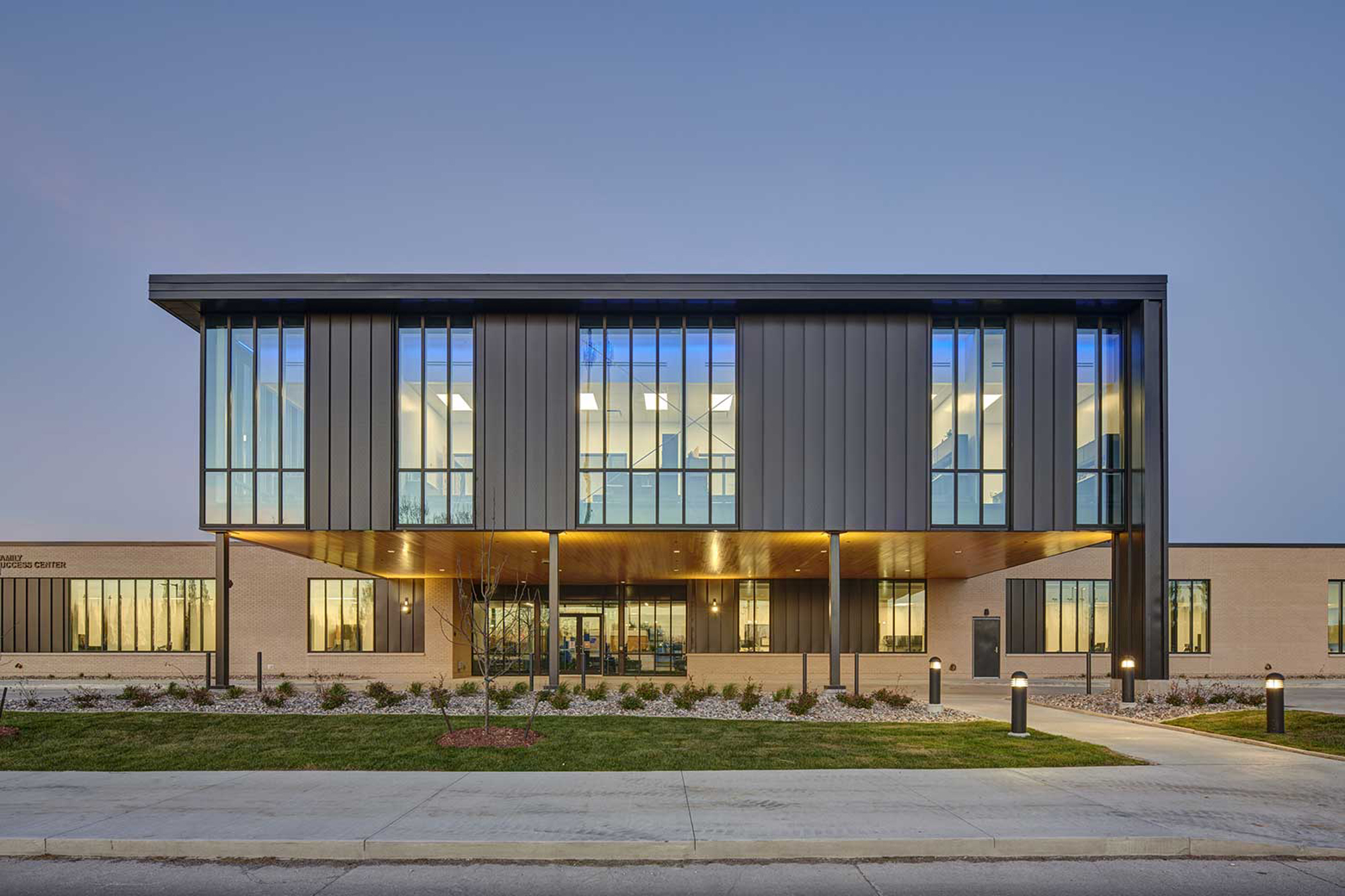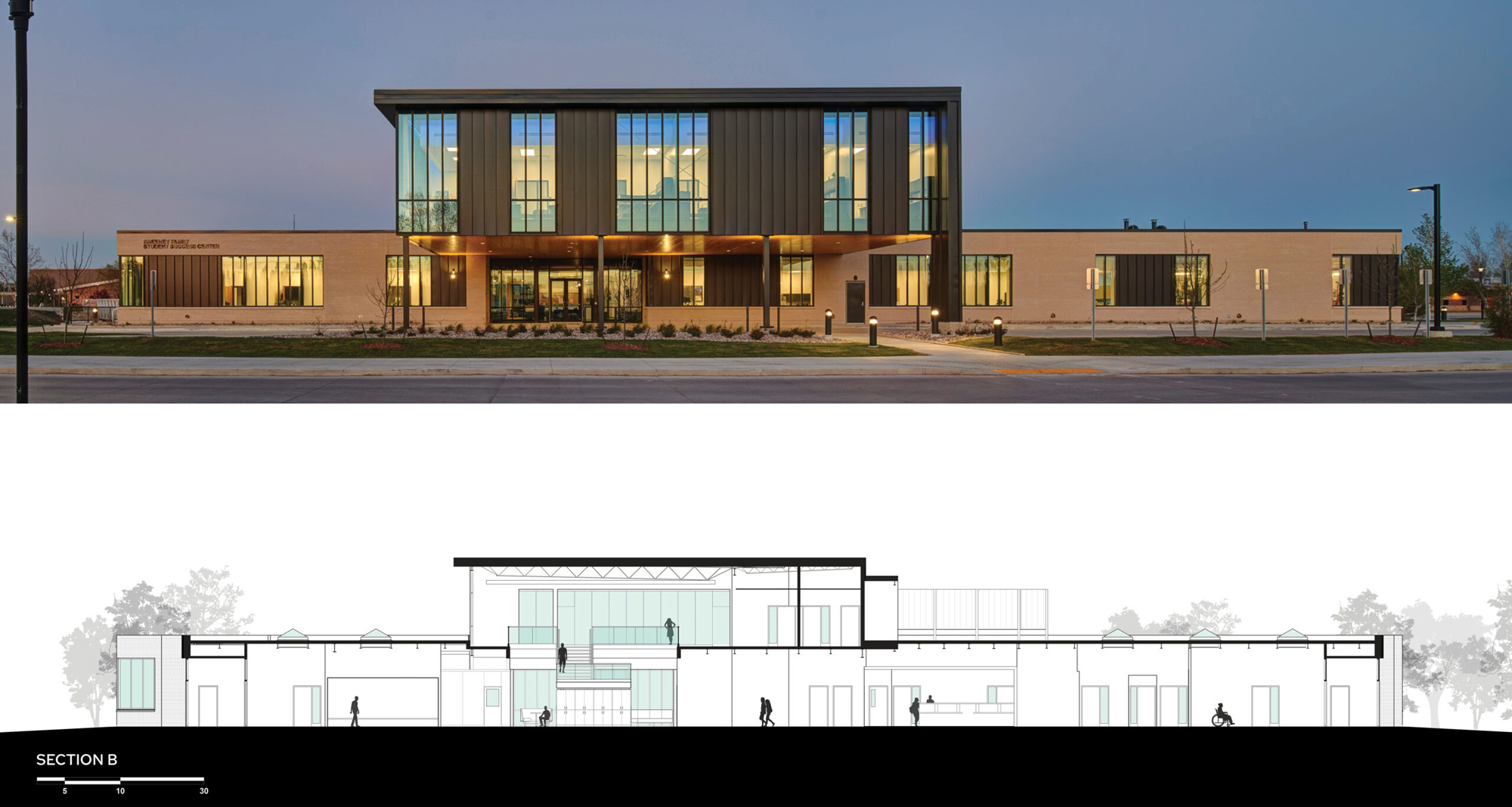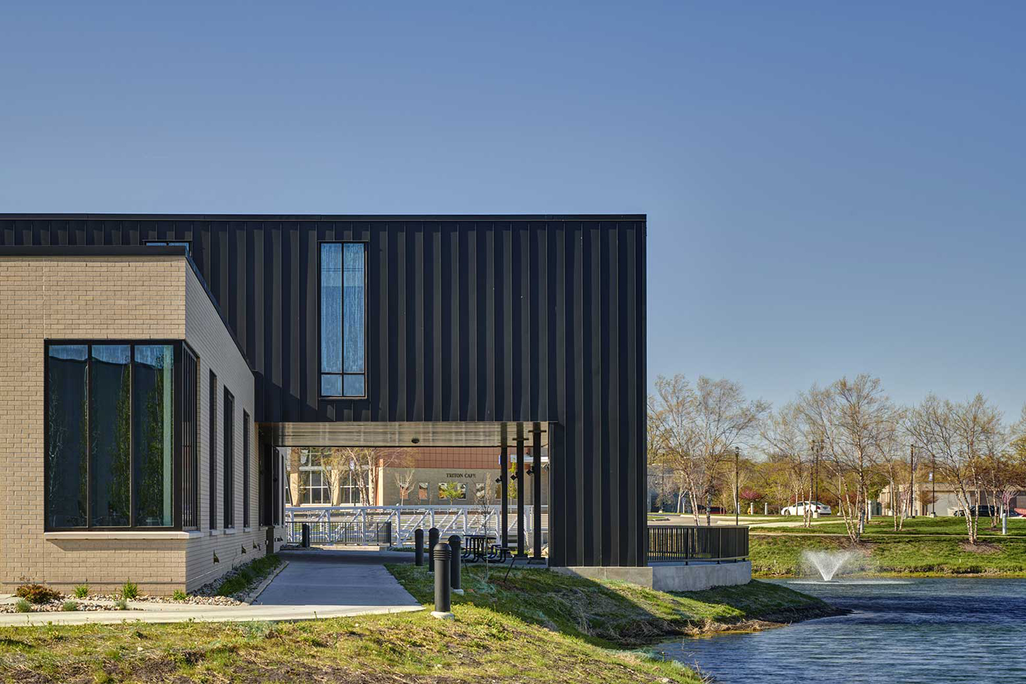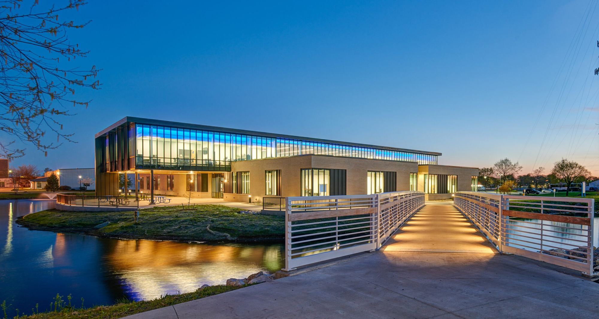 With the project site being surrounded by water on three sides, the building’s position allows for cross-axial circulation with a pedestrian bridge connecting to campus, a covered vehicle drop off, a covered patio, and prime views of the pond and campus. Daylight is harvested through northern glazing and an atrium. The atrium also serves as a wayfinding point and place of social interaction.