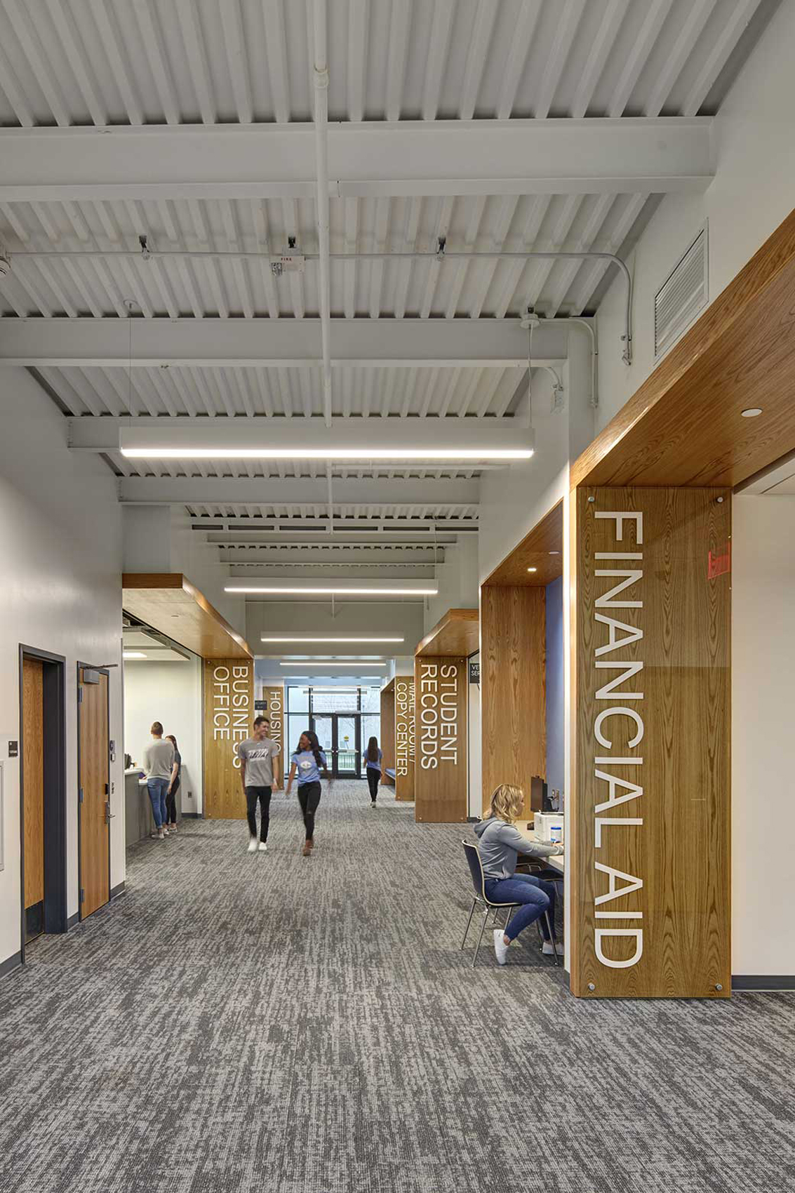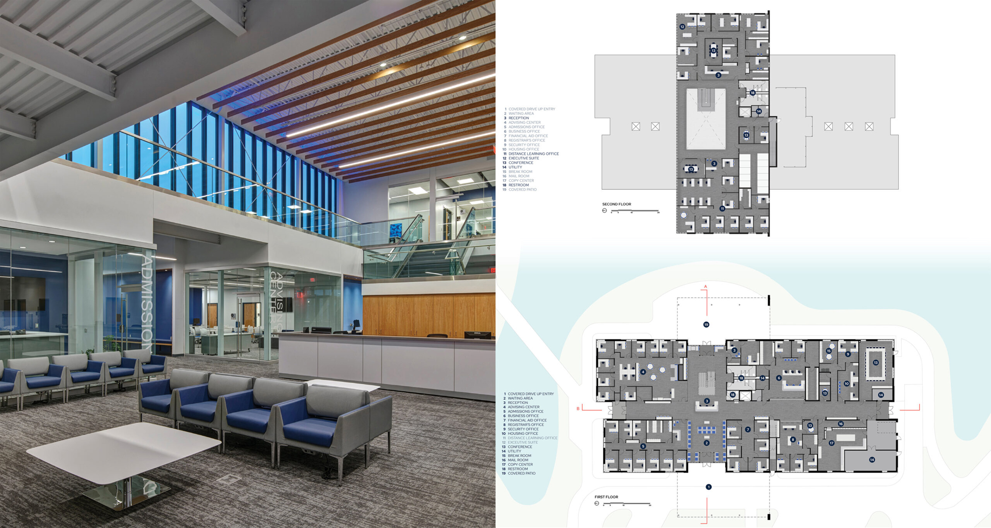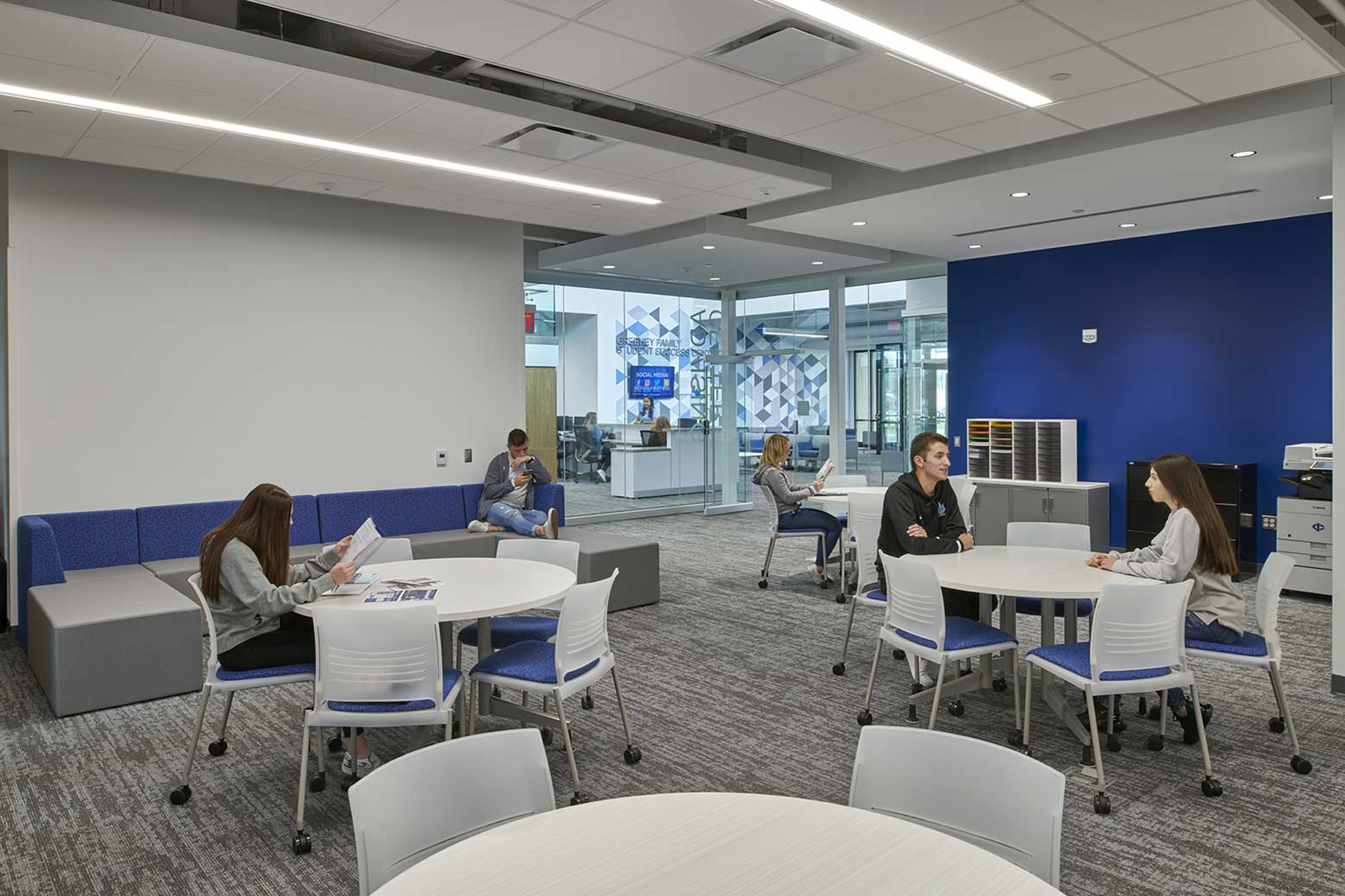 The design establishes a series of student collaboration spaces, private work spaces, conference rooms, and department offices and creates a new campus focal point that is set to serve the college’s future student success.