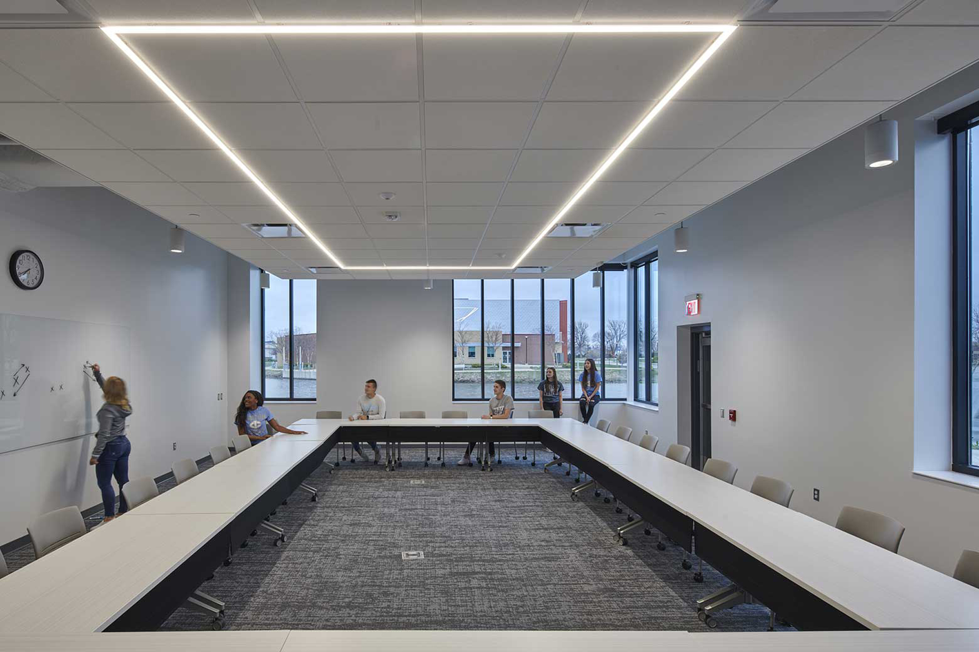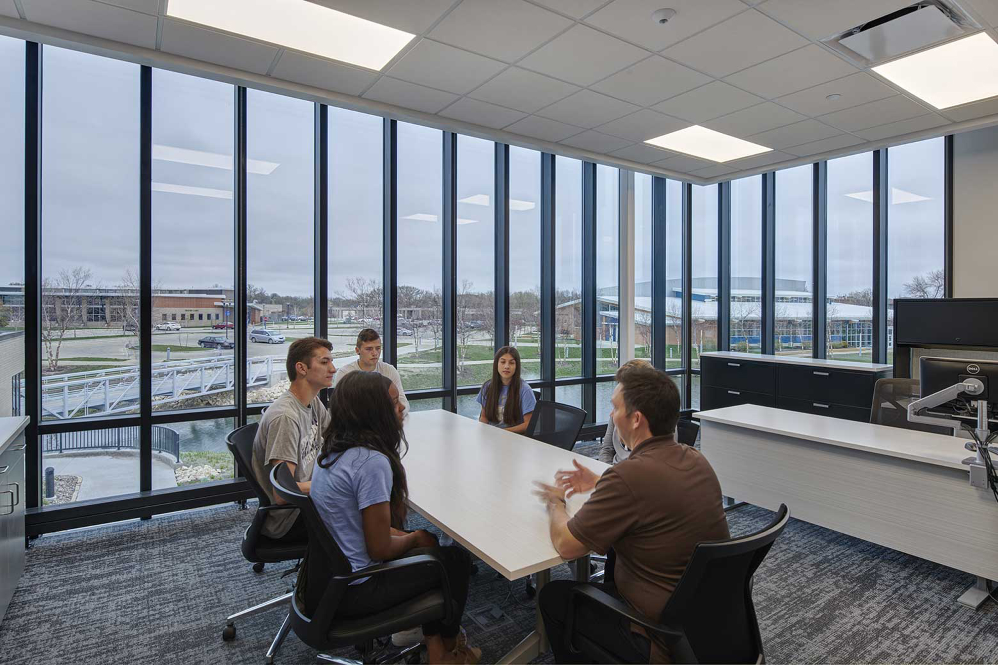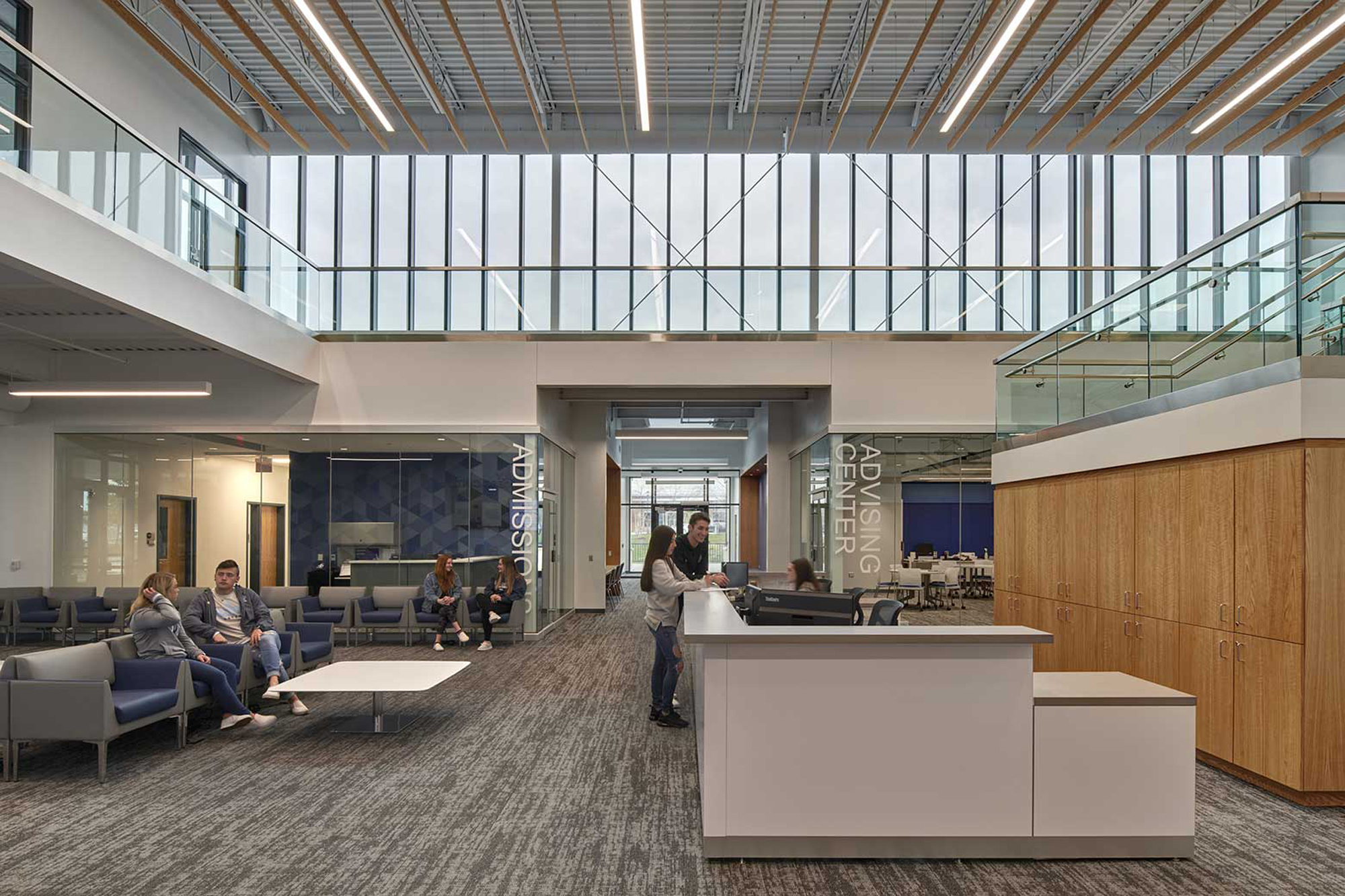 The design establishes a series of student collaboration spaces, private work spaces, conference rooms, and department offices and creates a new campus focal point that is set to serve the college’s future student success.