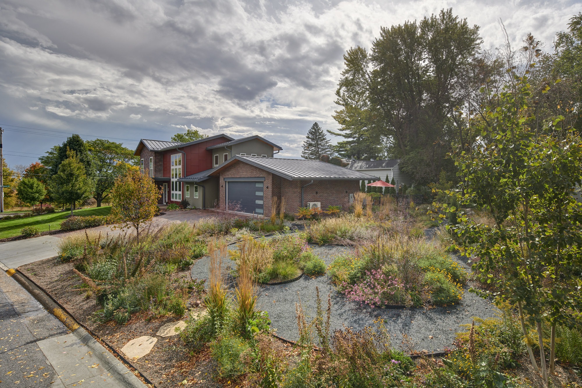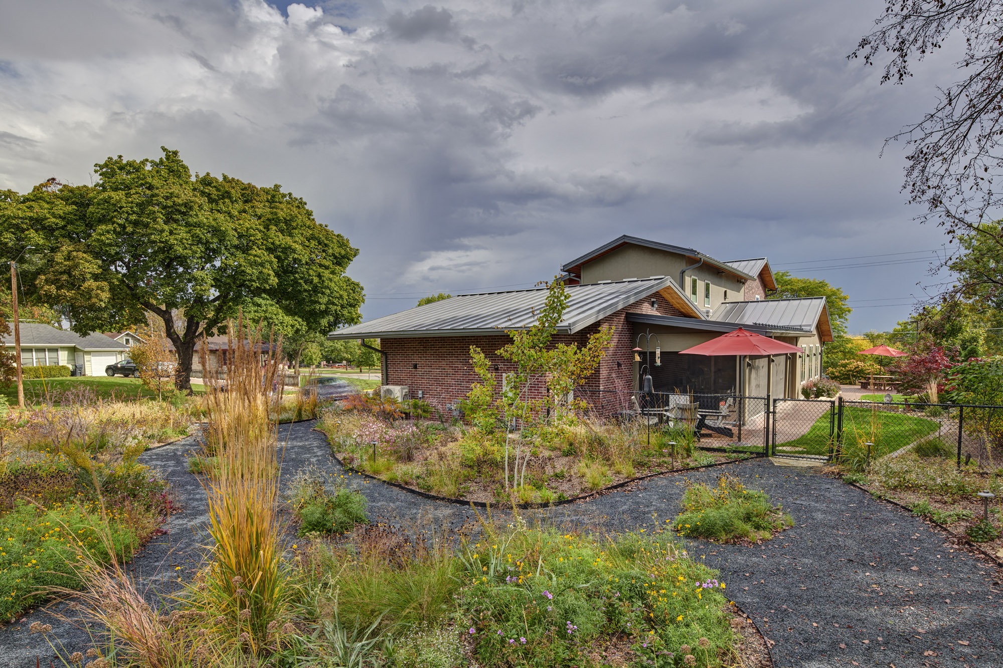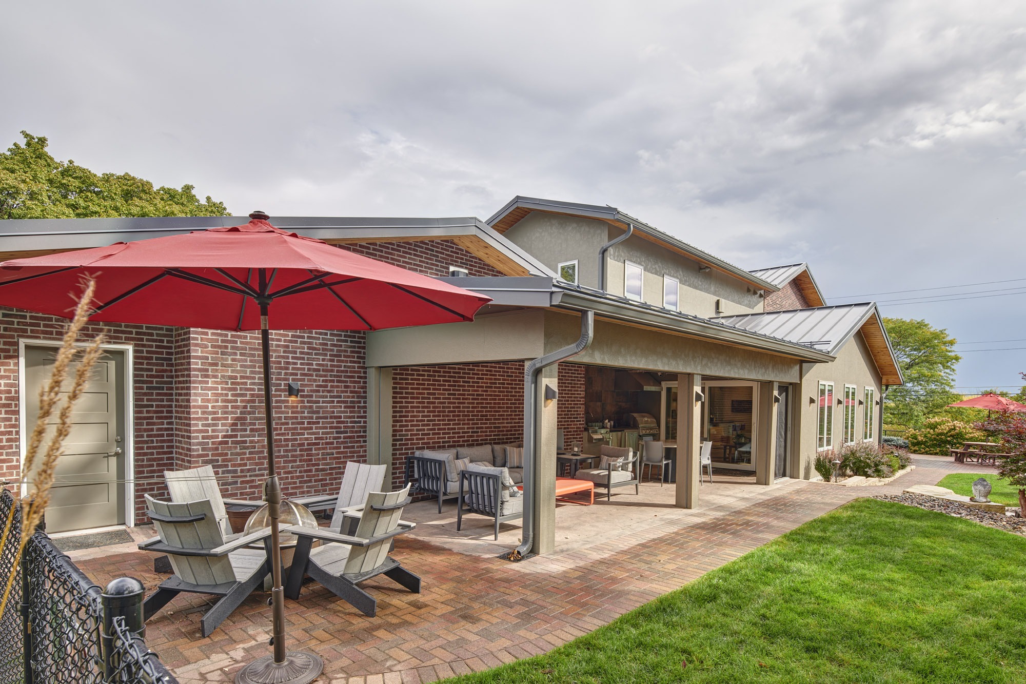 Beyond the addition, special care was taken with the landscape design by incorporating pavers to match the existing, adding a fire pit off the covered space, and creating a prairie garden with a variety of plantings and a rock path.