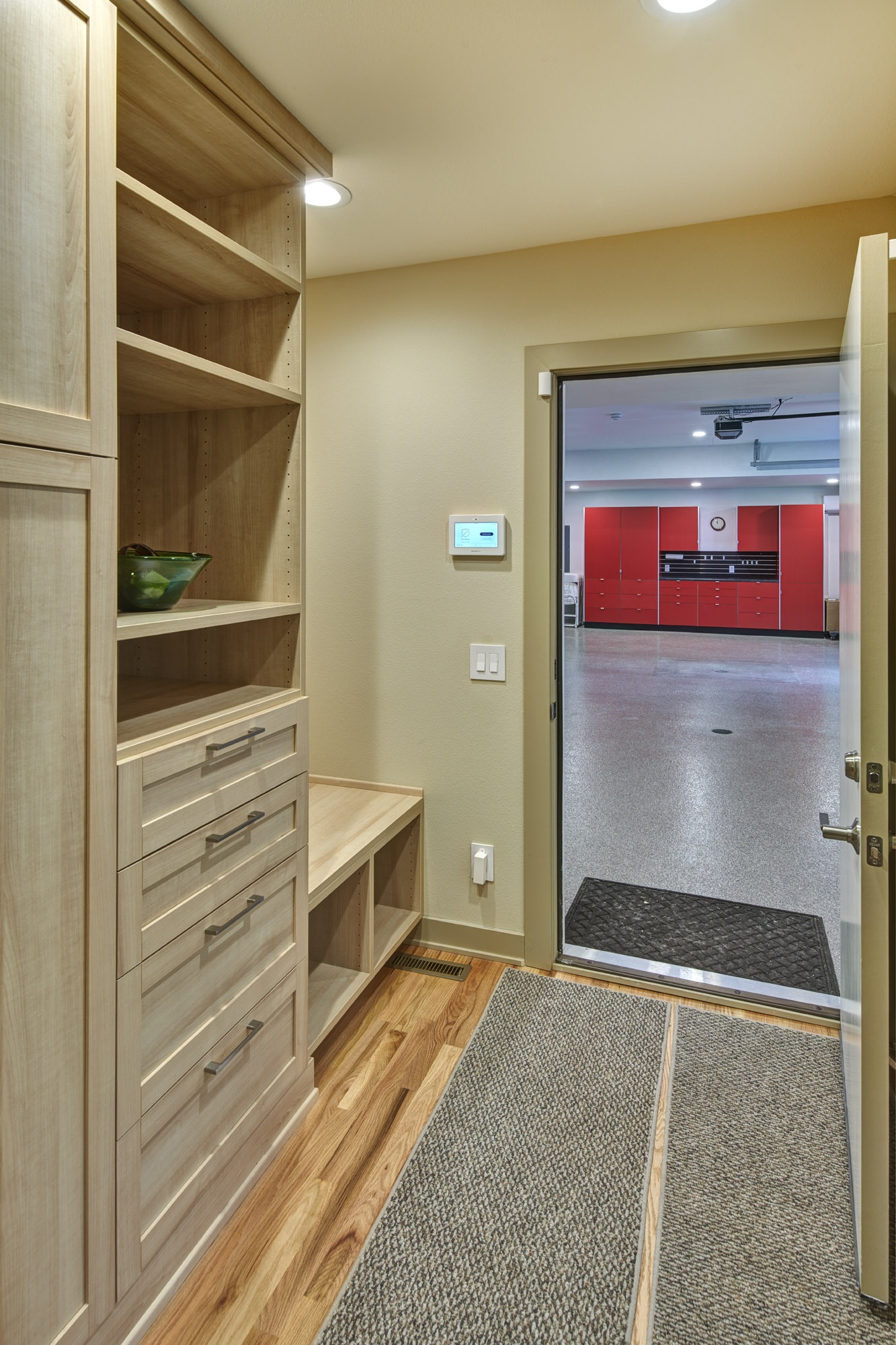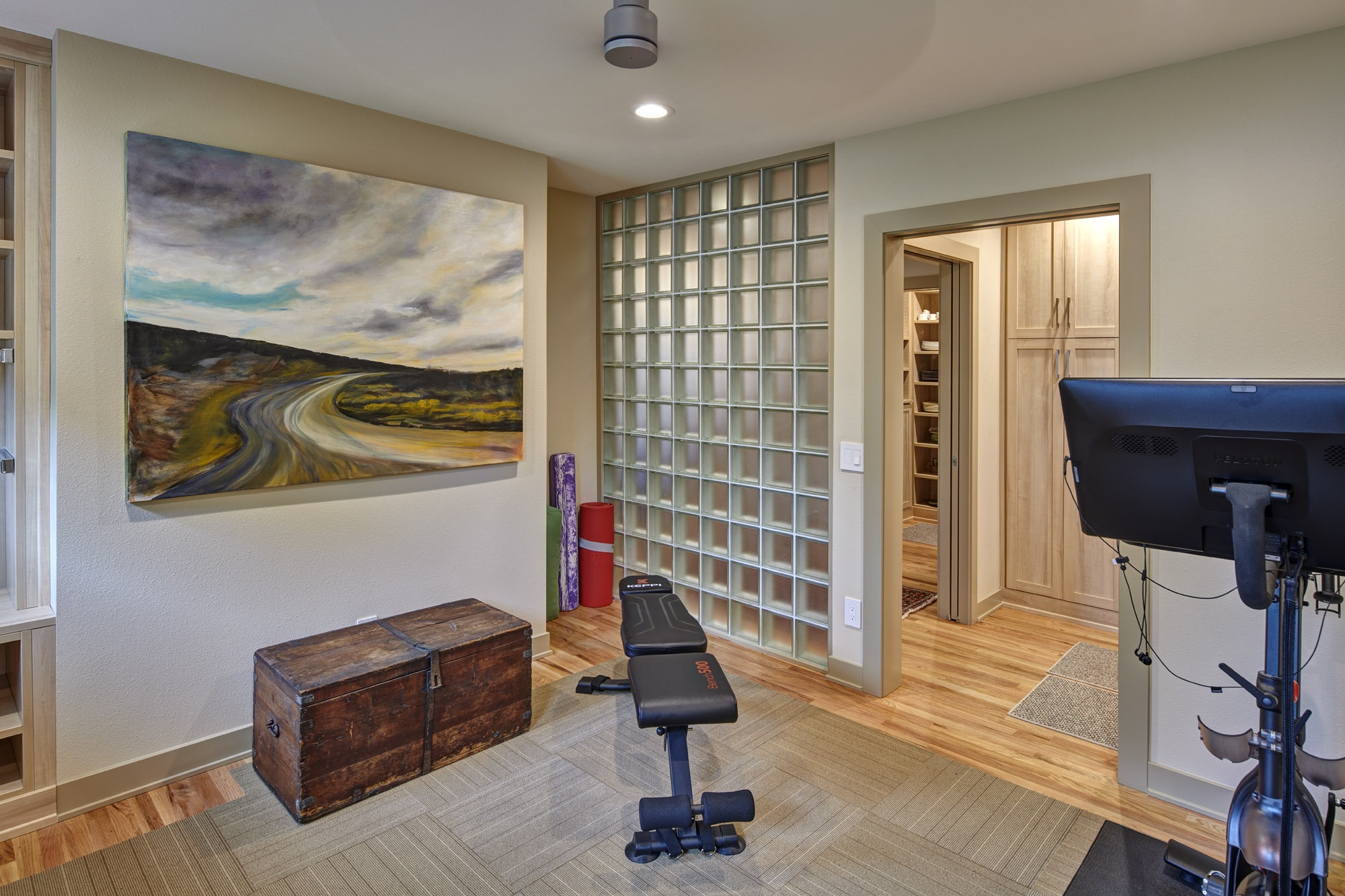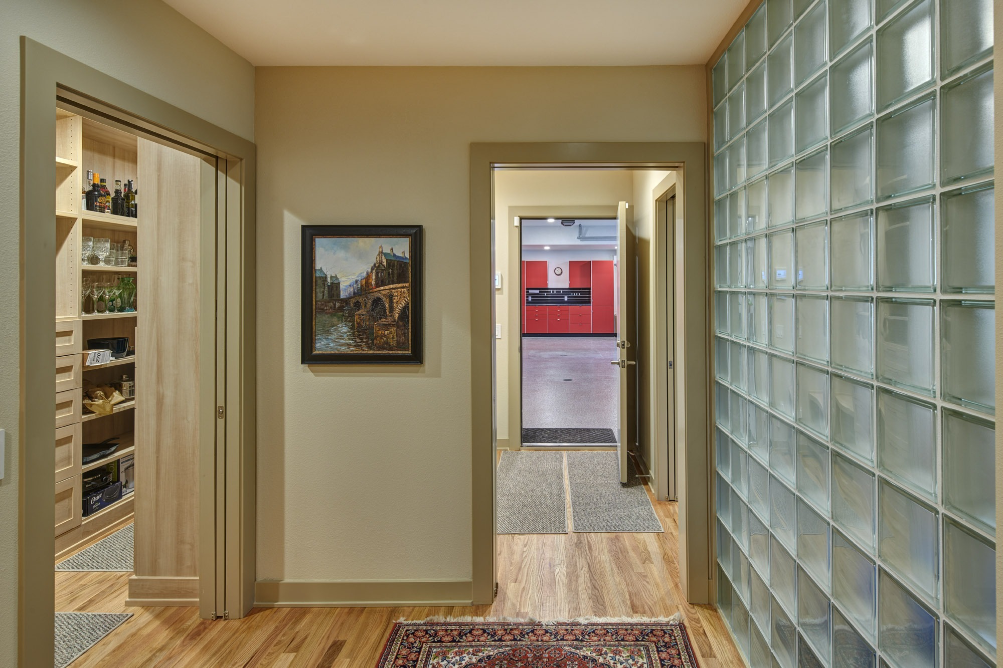 The new zero-entry oversized garage leads to a mudroom, pantry, and exercise room that infill the location of the original single-car garage and are now conveniently located off the kitchen. These spaces feature custom built-in cabinetry, natural light, and material selections with respect to the existing home.