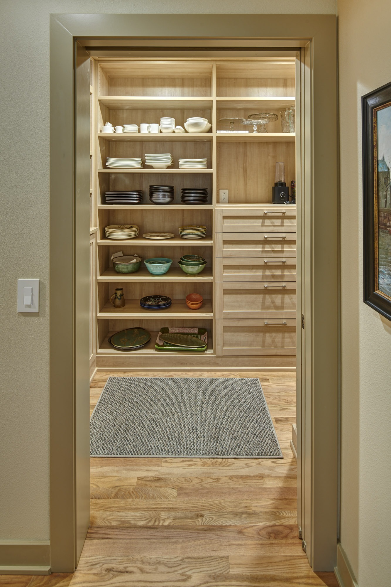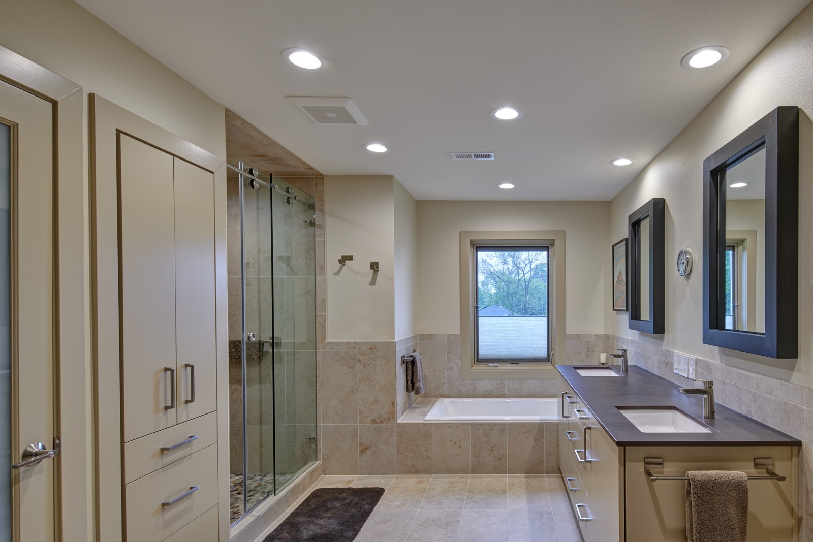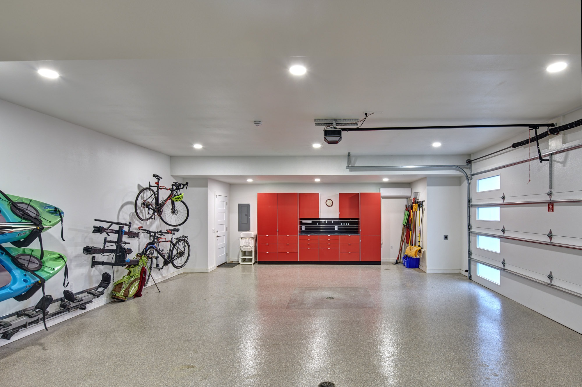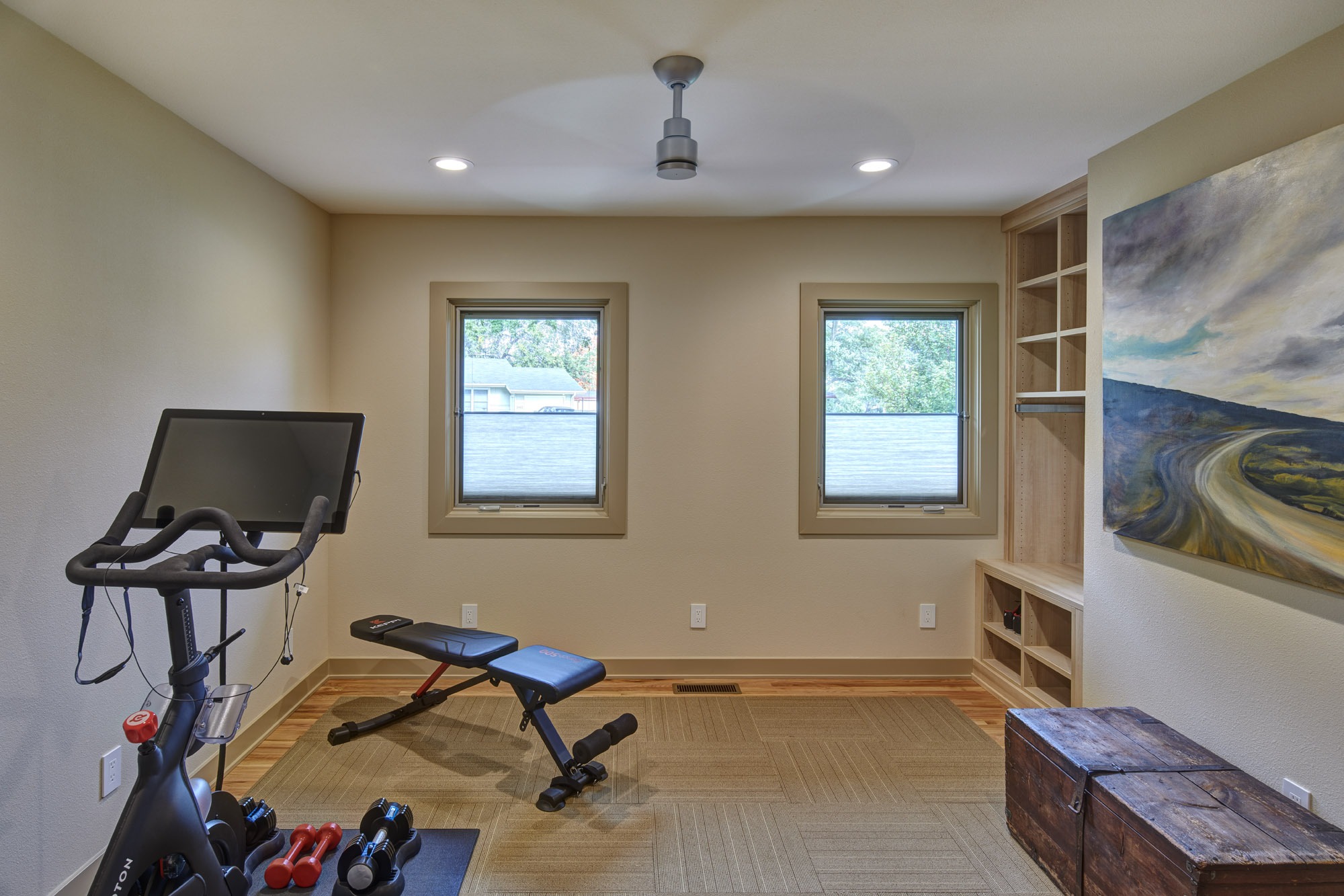 The new zero-entry oversized garage leads to a mudroom, pantry, and exercise room that infill the location of the original single-car garage and are now conveniently located off the kitchen. These spaces feature custom built-in cabinetry, natural light, and material selections with respect to the existing home.