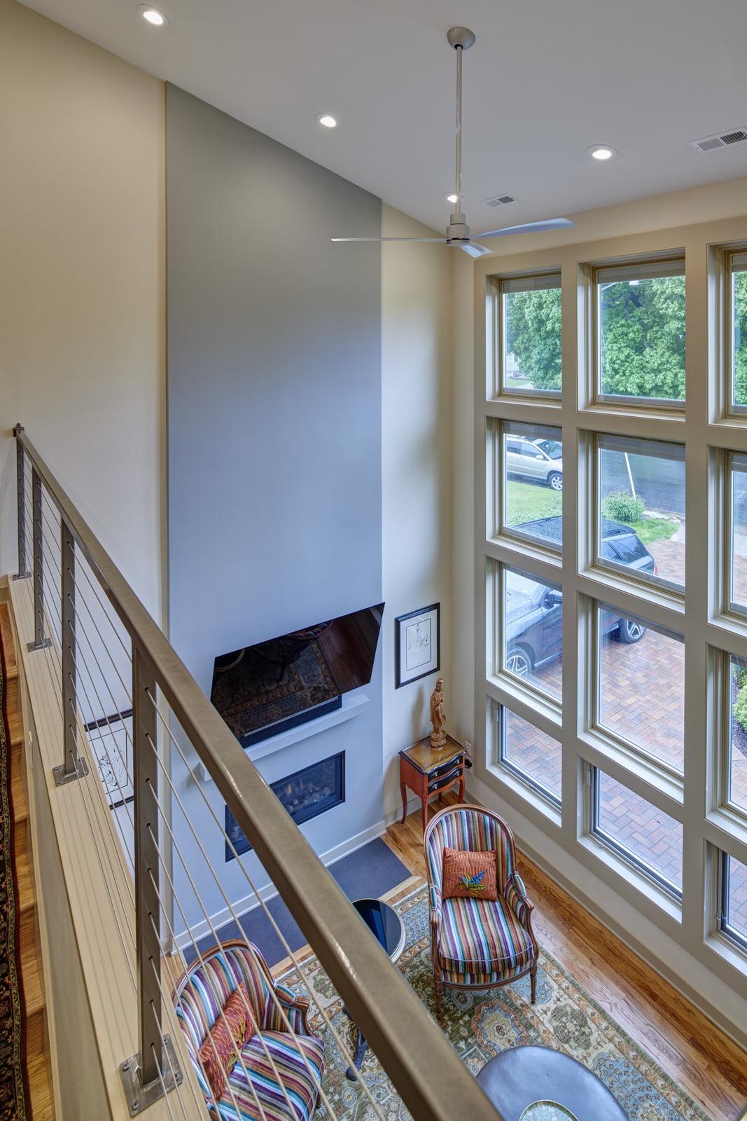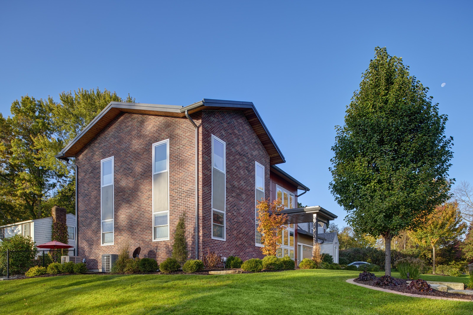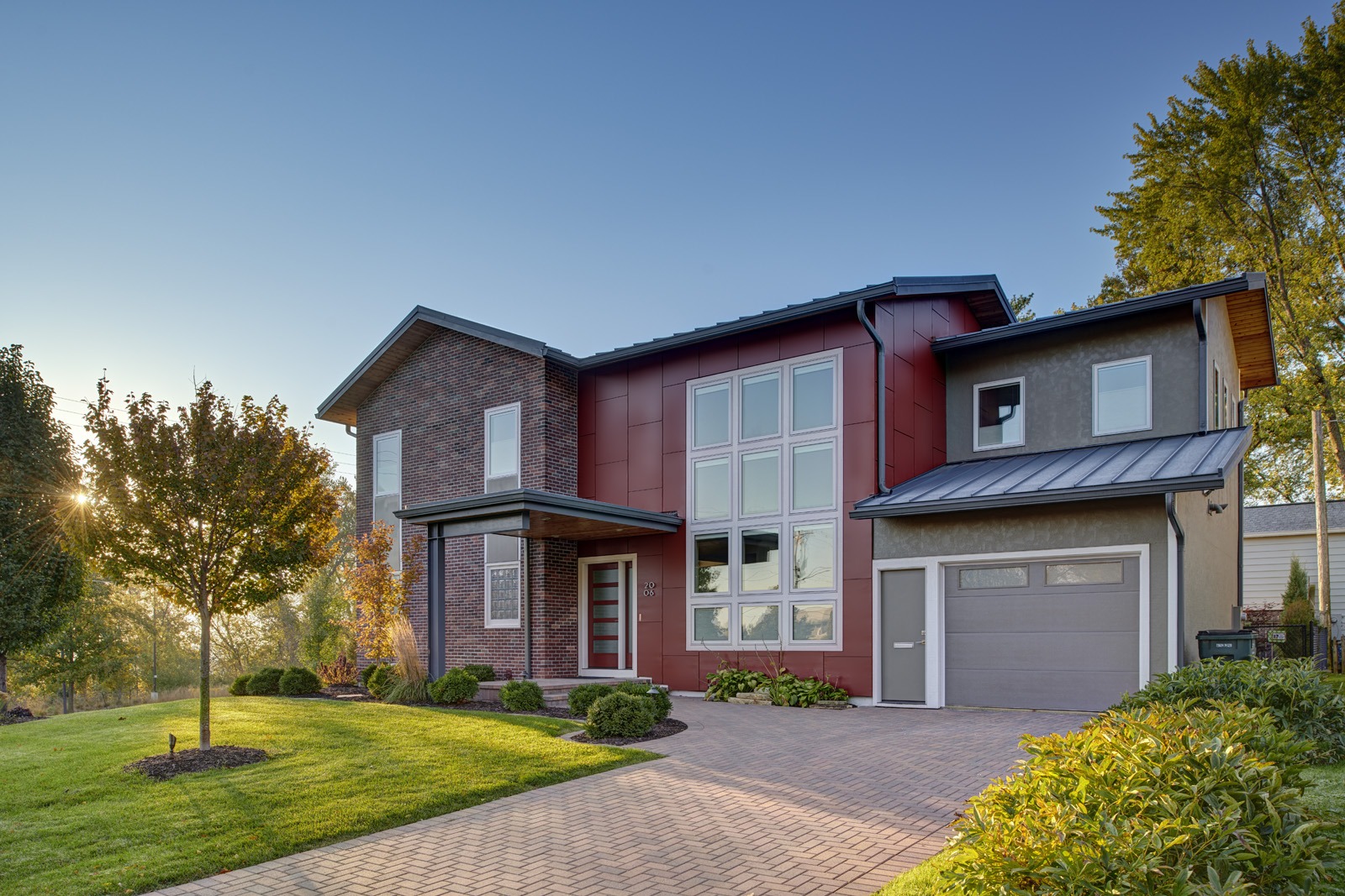 The upward addition allowed the low ceilings of the existing living room to be expanded into a double height space. The selected interior materials complement the recently remodeled lower and main level. The exterior design draws inspiration from Iowa State University and the Alumni Center located across the street from the residence. The use of cementitious exterior siding along with brick masonry are low maintenance and provide durability and longevity for the life of this home. The standing seam metal roof, stained cedar soffit, and flat roof entry provide a distinctly modern aesthetic to the home.