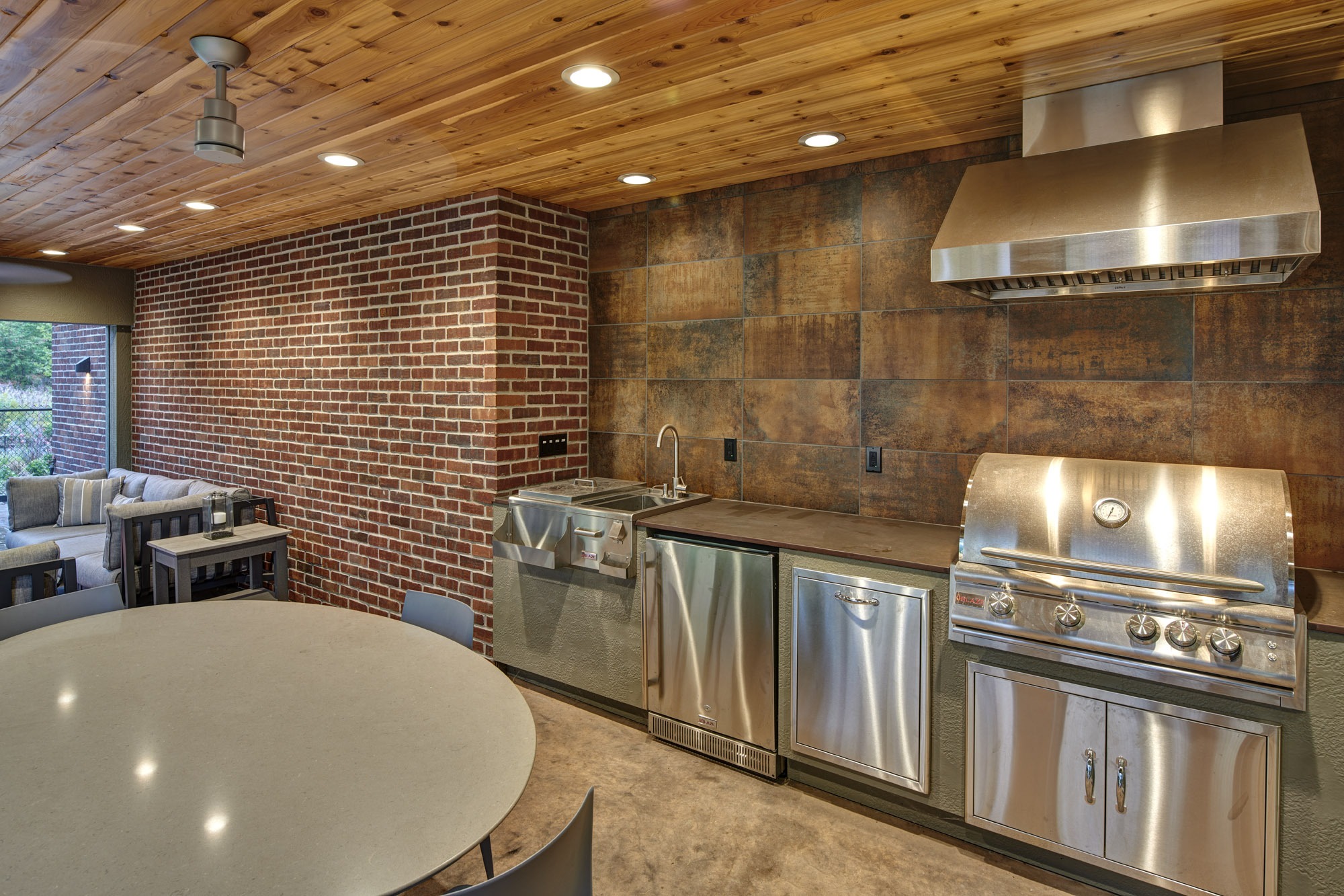 A new covered outdoor space extends off the kitchen. Equipped with a built-in grill, beverage bar, electric screen system, and radiant heat, the space is built for entertaining.