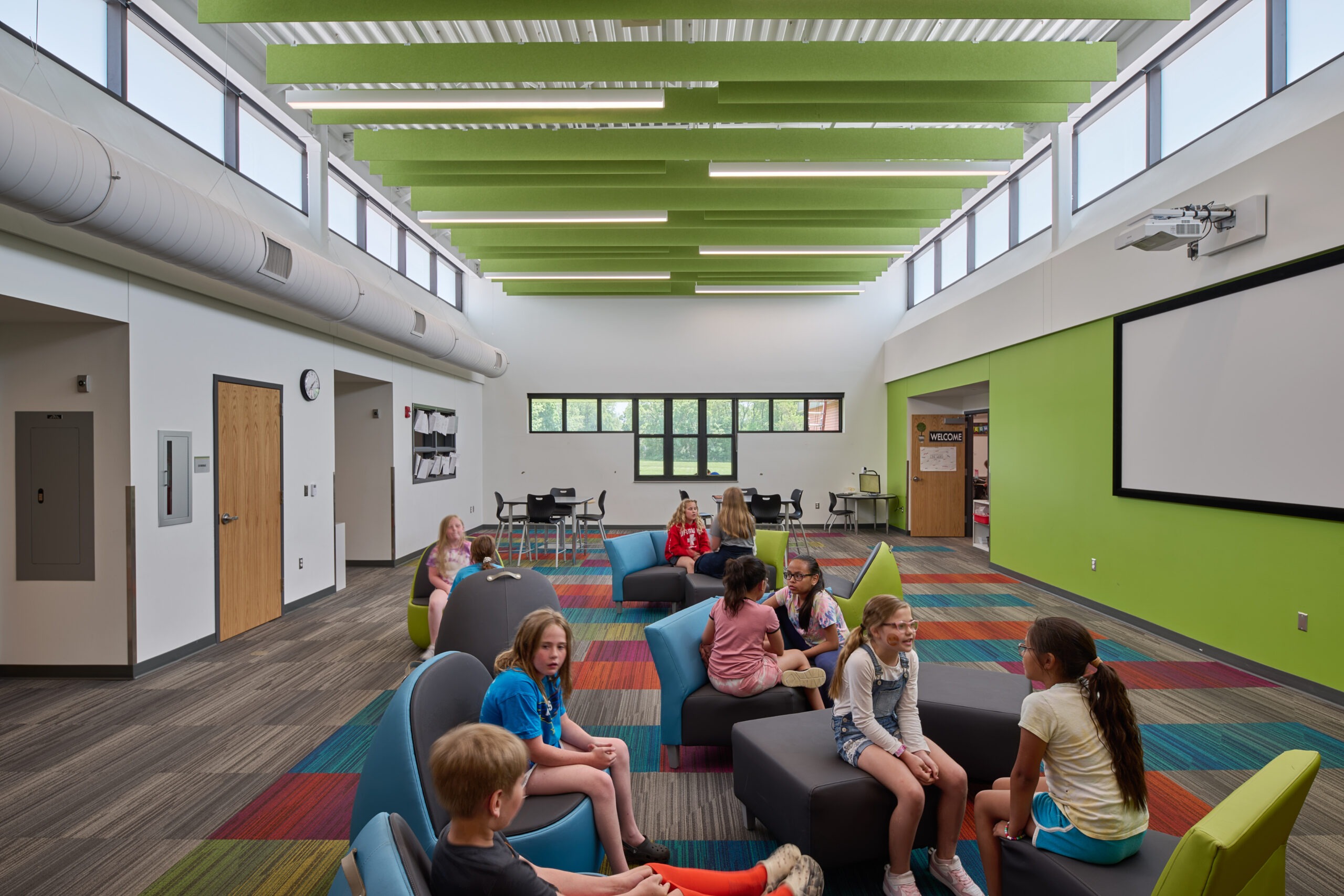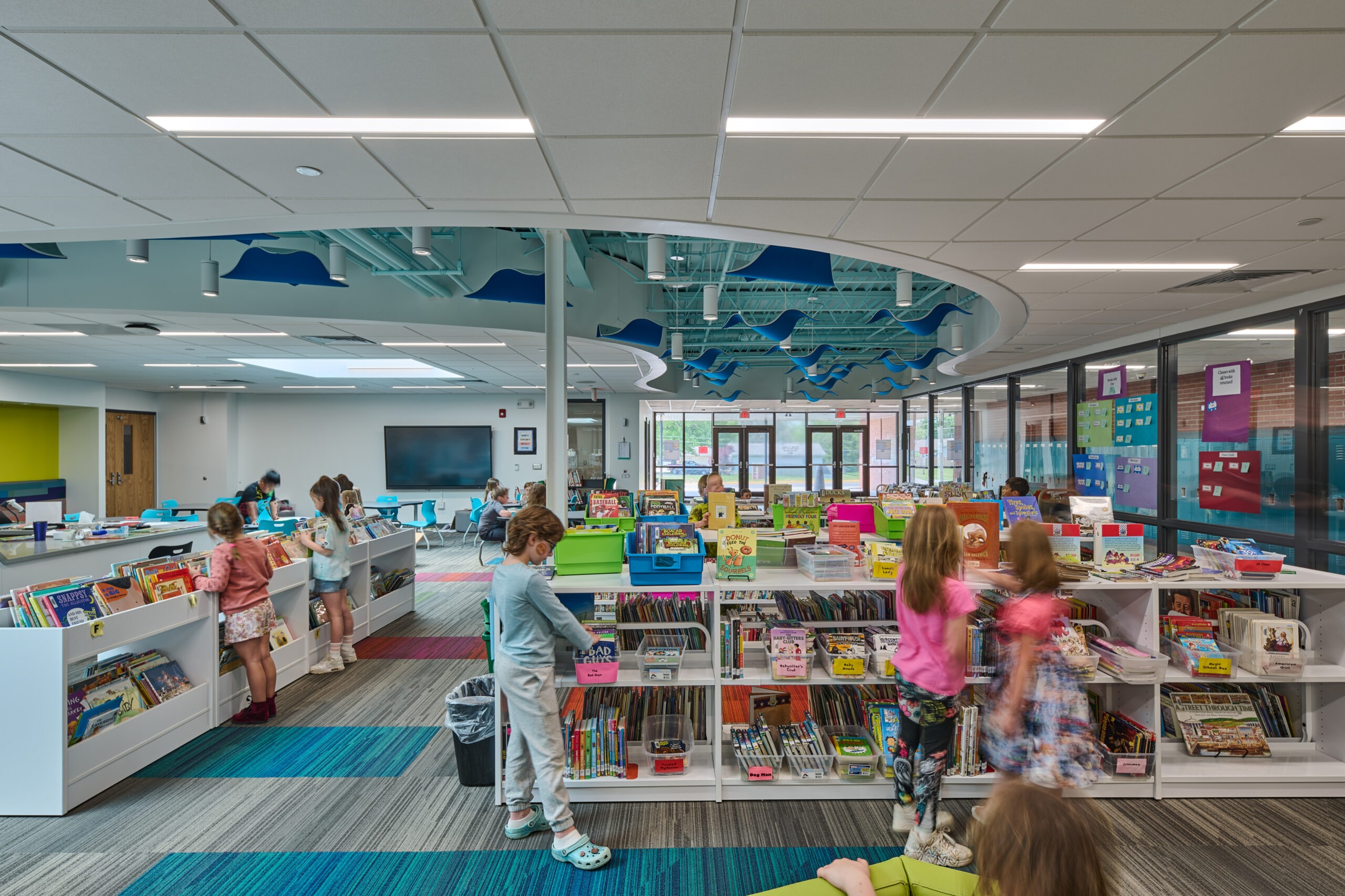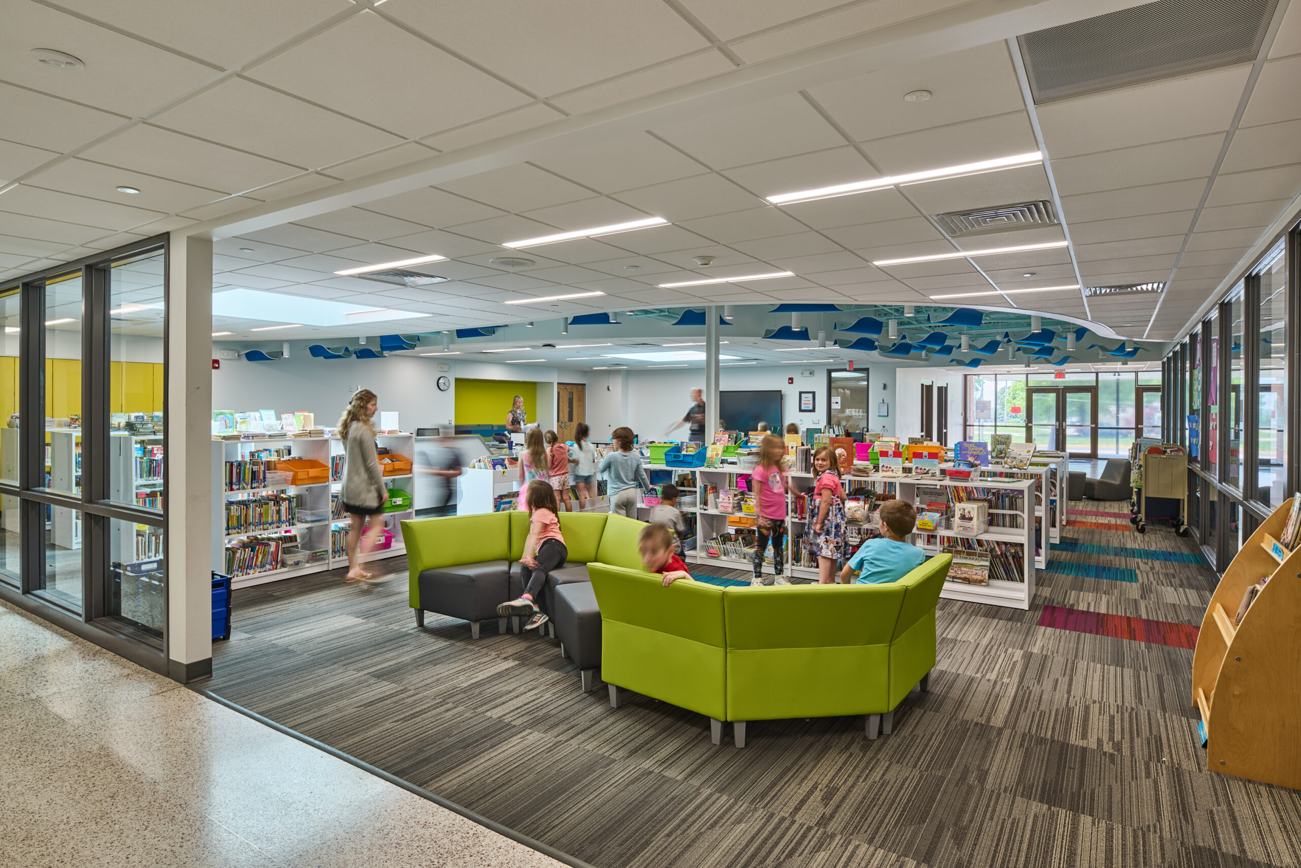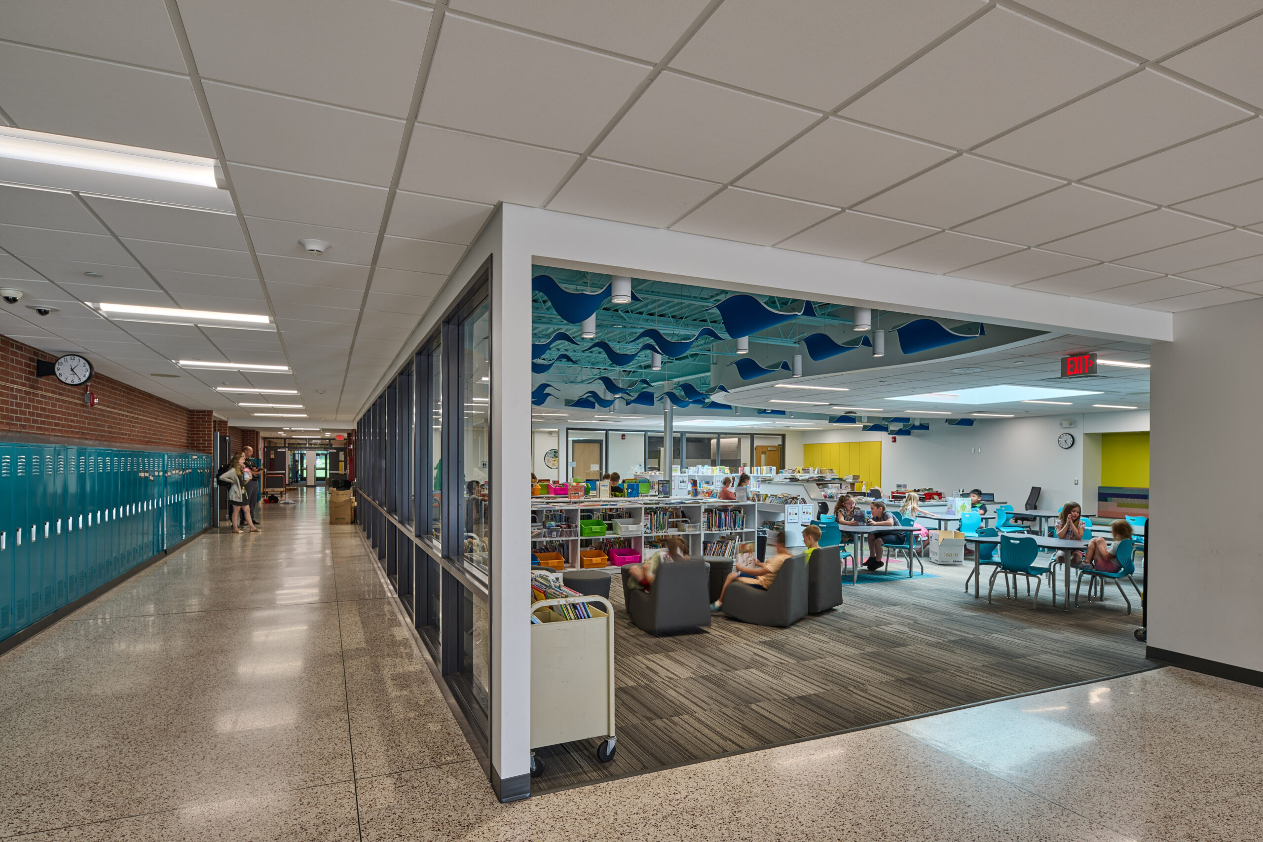 A classroom addition and renovation provides student-centered spaces and updated learning environments. In addition, the media center has been expanded at a new, more central building location while the cafeteria has been improved with natural daylight and better acoustics.