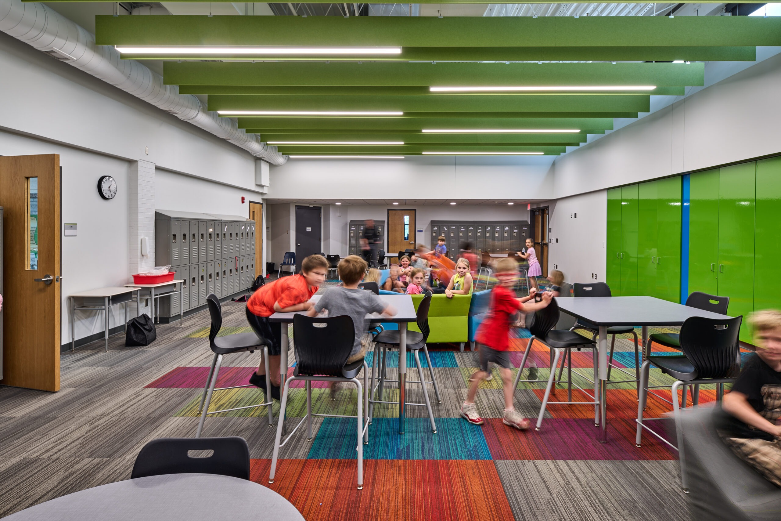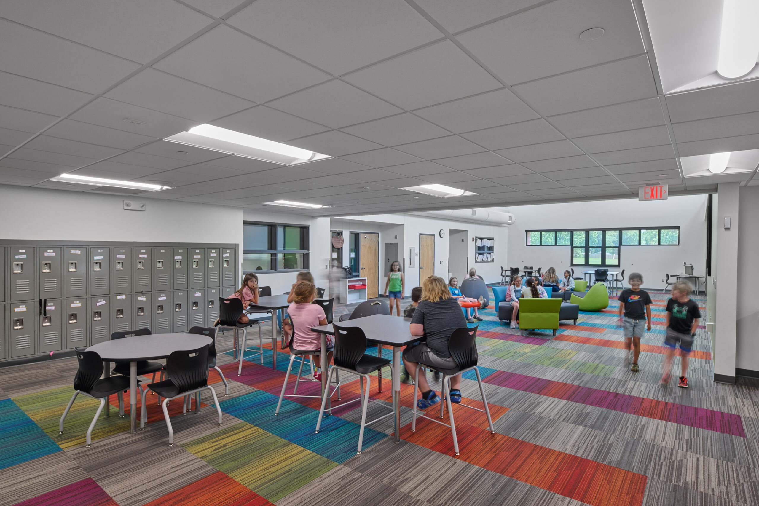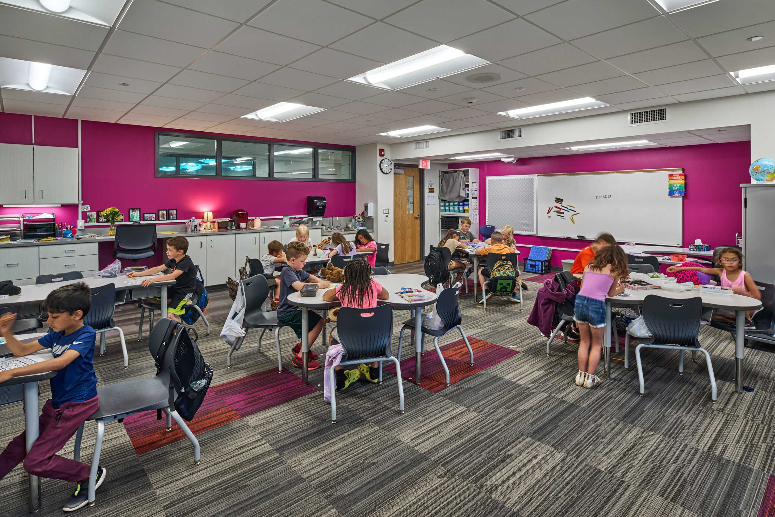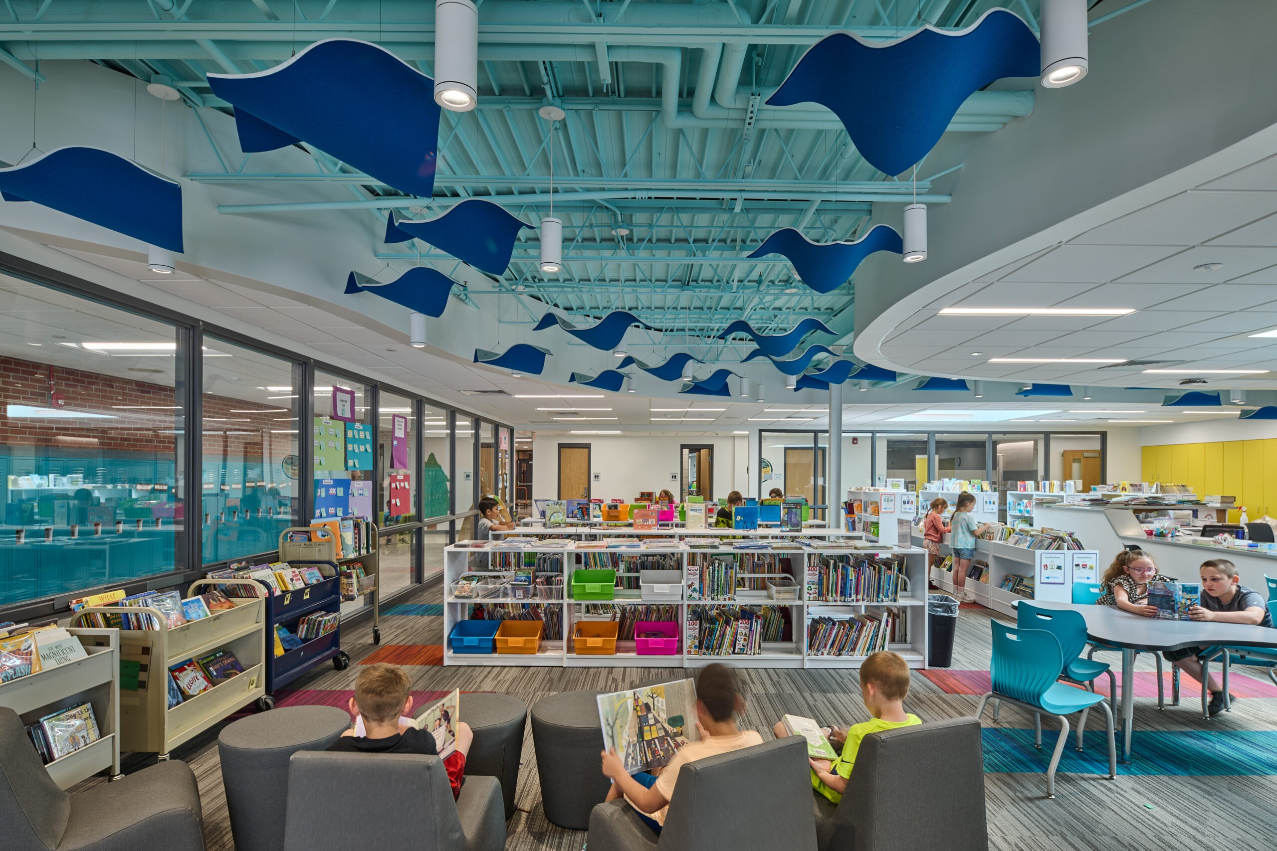 A classroom addition and renovation provides student-centered spaces and updated learning environments. In addition, the media center has been expanded at a new, more central building location while the cafeteria has been improved with natural daylight and better acoustics.