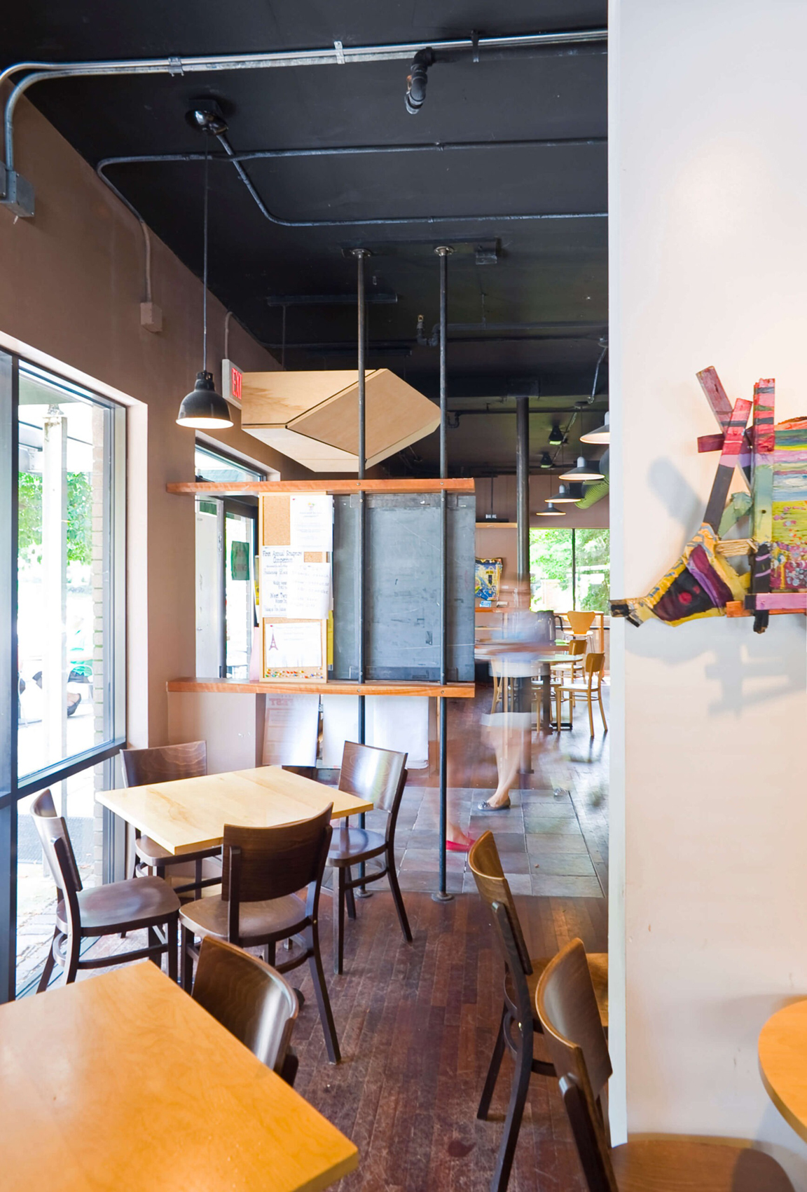 Direct lighting was incorporated at the various wall expanses to allow the restaurant to double as a gallery for local artists. The effect of the gallery space coupled with the dramatic interior design and excellent food and beverage offerings have effectively created a lively ‘third place’ for customers. Ultimately, the aggressive vision of the owner and the successful realization of that vision for the designed space have allowed Stomping Grounds to become a model business for the Campustown district.